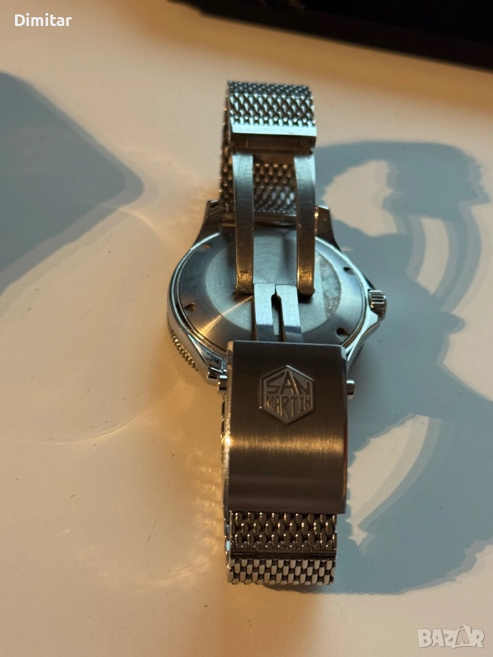 2. San Martin SN0119-G. Много качествен часовник, носен много малко, с минимални забележки. Сапфир кристал, много удобен размер от 40мм, gmt функция и страхонта миланезе верига, с on the fly регулиране. Звената на веригата са на винт. Носен много малко, в комплект с кутия и документи. Фолиото на задния капак все още не е махнато. Цена: 190EUR