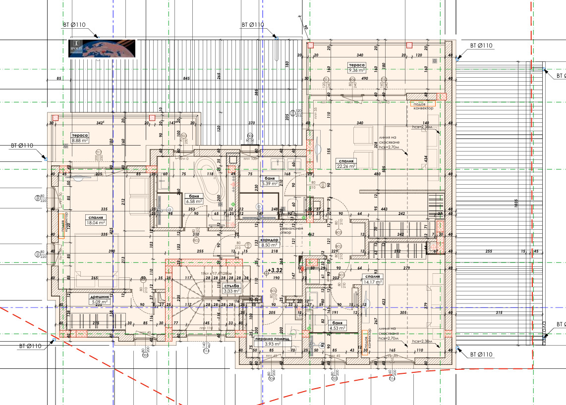 ОВК: термопомпа Daikin - 16 КВ, с допълнителен ел. нагревател 3+3 kW DAIKIN с wi-fi управление, за отопление и охлаждане, с монтирани подови конвектори и изградено подово отопление. Топлата вода се осигурява от 300 л. бойлер, с 2 серпентини (втората, свързана със соларна система на покрива).