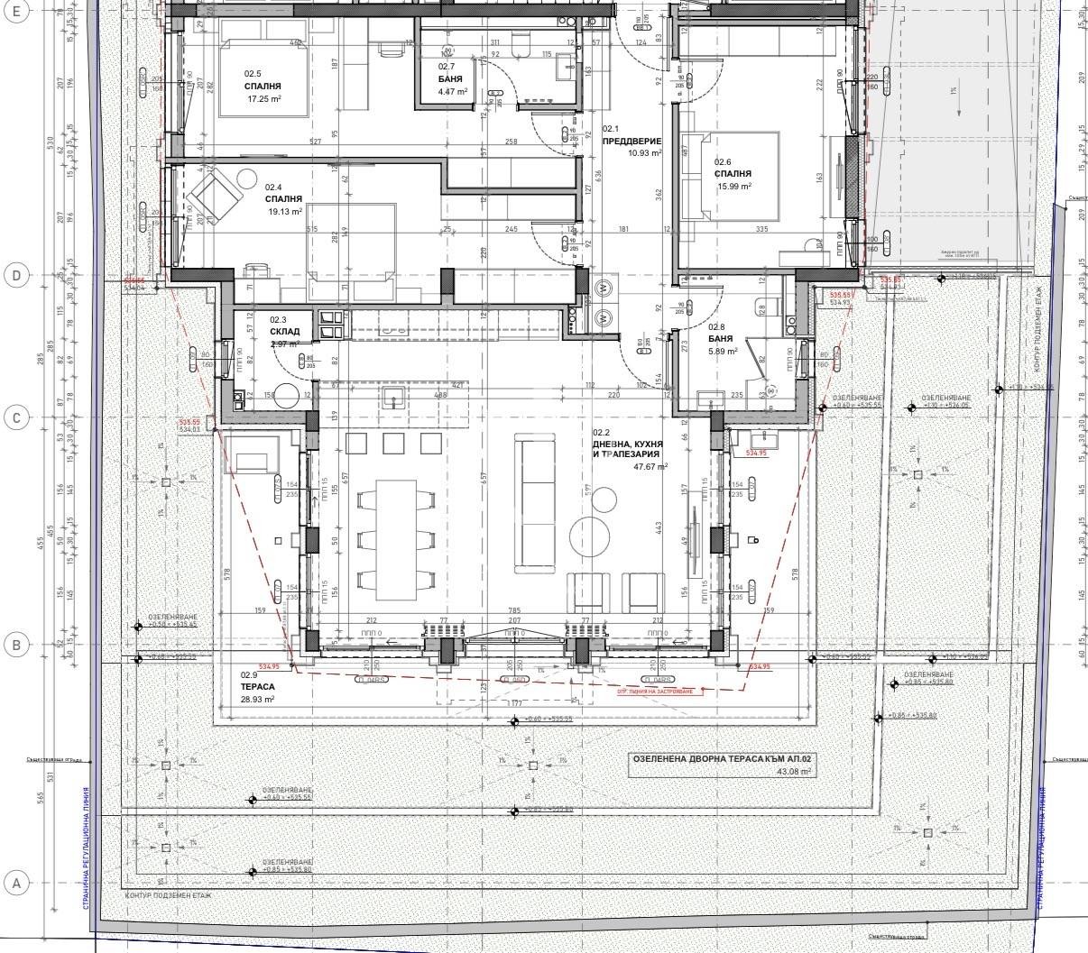 Разпределението на апартамента включва предверие, две спални, баня и тоалетна, родителска спалня с баня и тоалетна, всекидневна с кухня и трапезария, складово помещение, веранда и собствен двор. Цената е без включен ДДС. Ref. ID:28495