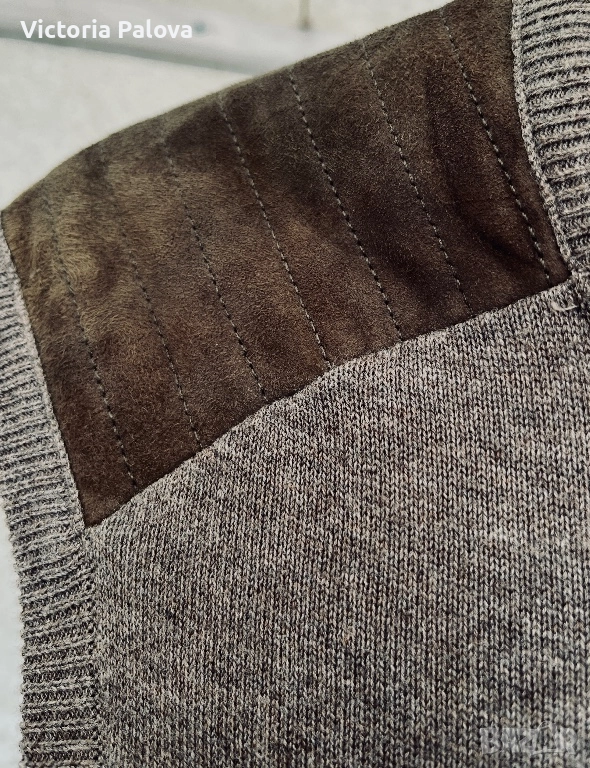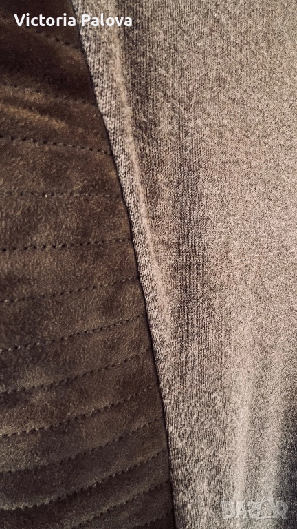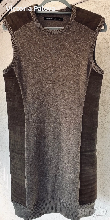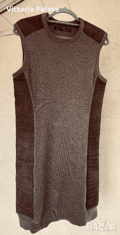 Рокля в красив бежов цвят от гладко плътно плетиво ( памук) , което стои елегантно по тялото. Най- впечатляващият ѝ детайл са страничните панели от естествена велурена кожа, които създават фин контраст в текстурата и придават ясно изразен дизайнерски характер. Велурът е натурален, мек и луксозен на допир - истински почерк на марка от висок клас - марка, известна със своя urban-lux, минималистичен и леко бунтарски стил. Роклята е effortlessly съчетава комфорт и стил, изглежда страхотно с боти, високи ботуши, кожа, тренч или по- масивно палто. Подходяща е за ежедневието и за по- изискани поводи - рокля, която съчетава комфорт, стил и характер. Рамо - 45см, ГО - 48см, дължина - 88см.