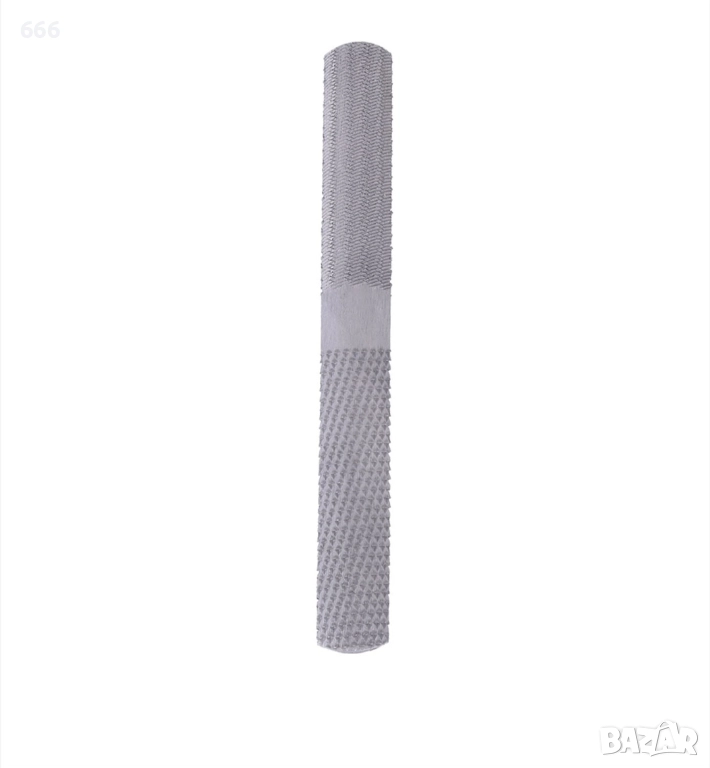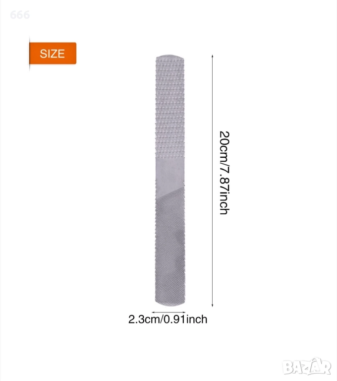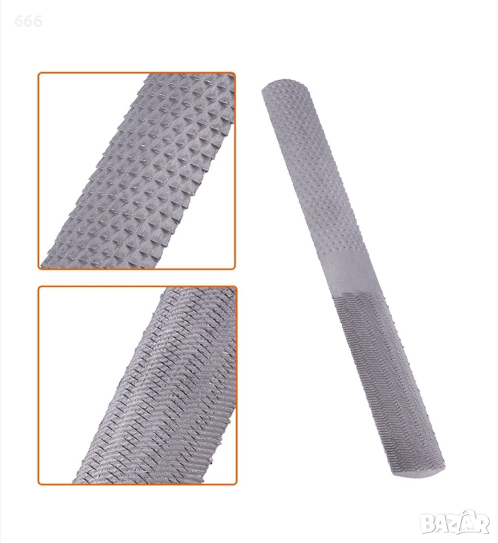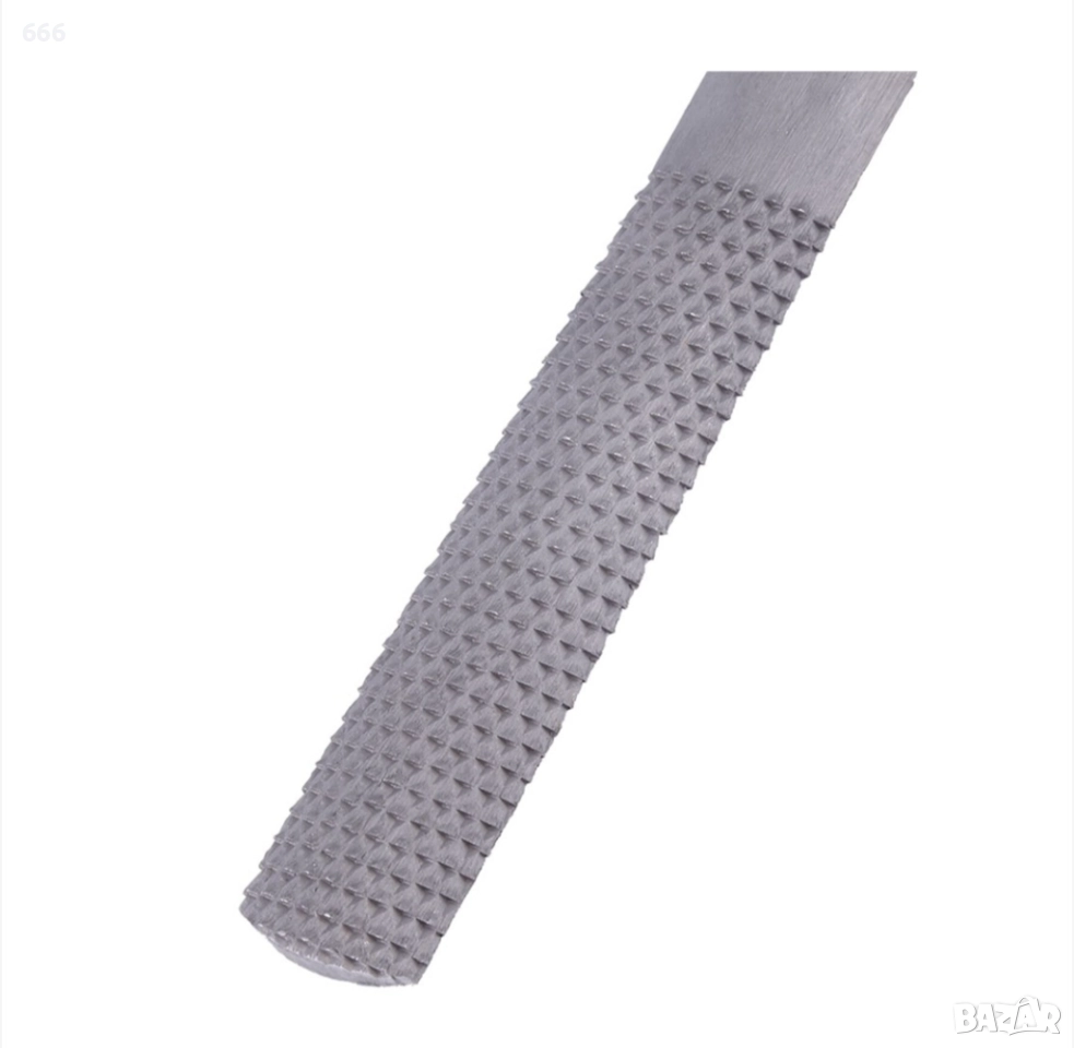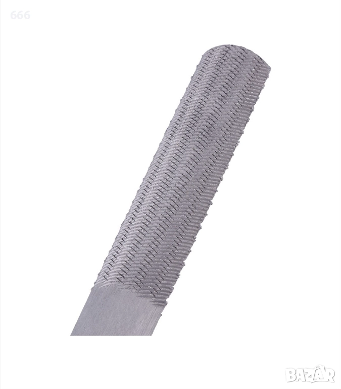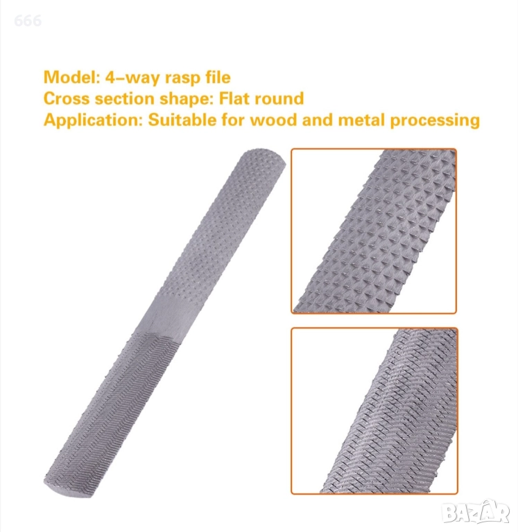 стомана и закалена и темперирана за здравина и издръжливост. Подходящ за приложения за обработка на дърво и метал. Край 1 е плосък, с изрязана страна напред, както и страна с дървена драска, а край 2 е полукръгъл, с изрязана страна и страна с дървена рамка. Повърхностите, обработени със скрепер, могат да се заглаждат.