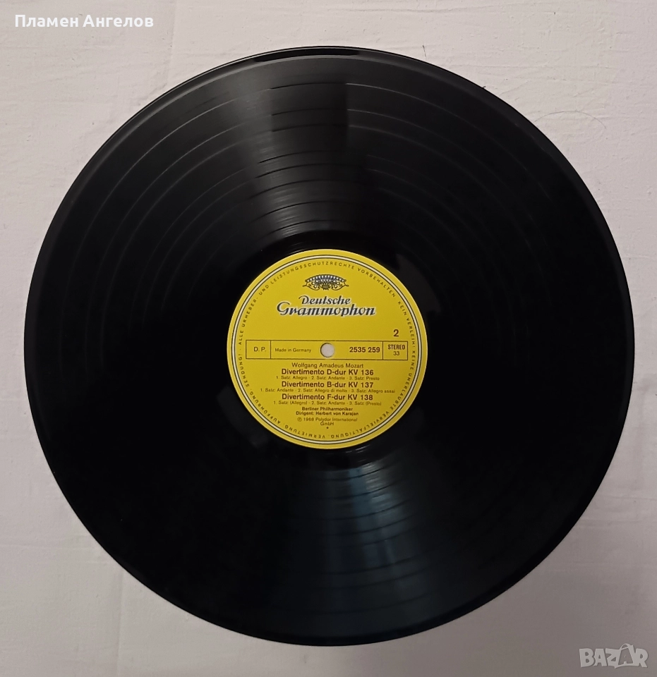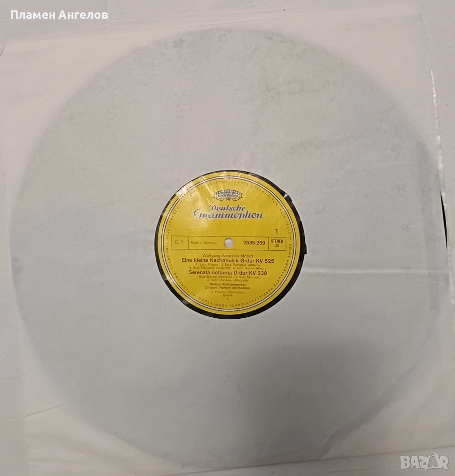 Ванилова плоча с компилация на Моцарт. Изпълнение на Берлинската филхармония под диригентството на Херберт фон Караян. Основни произведения "Малка нощна музика, Серенади, Дивертименти". Издадена от Grammophon-Resonance. Плочата е нова, без драскотини, безупречно състояние.