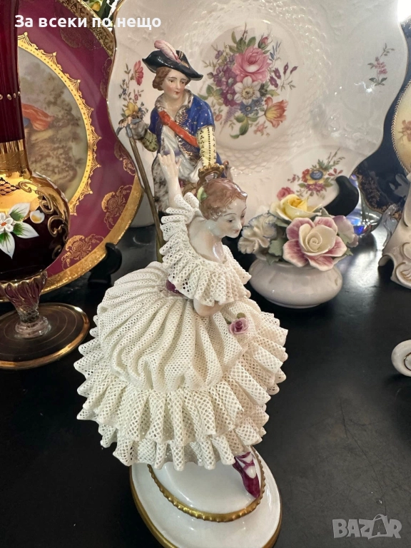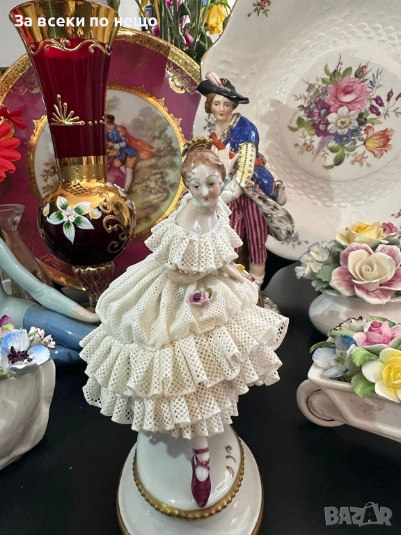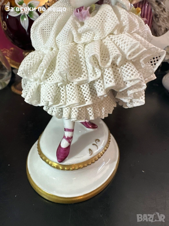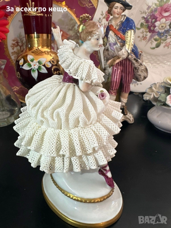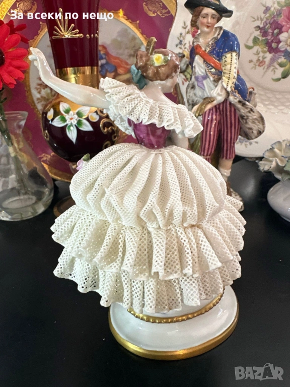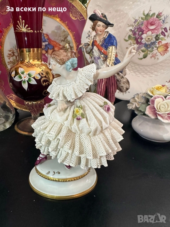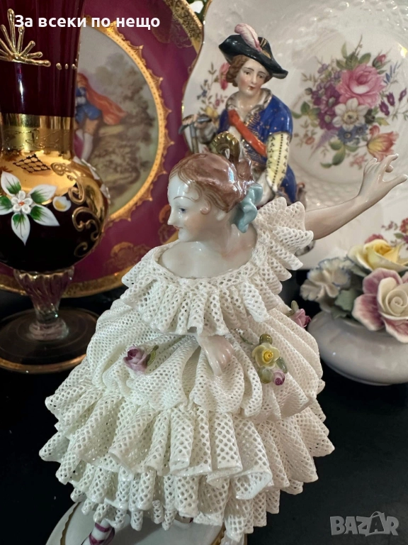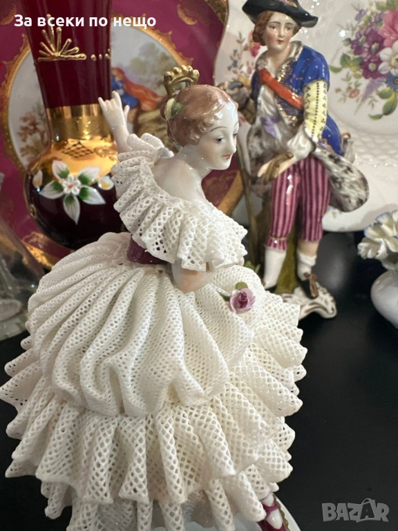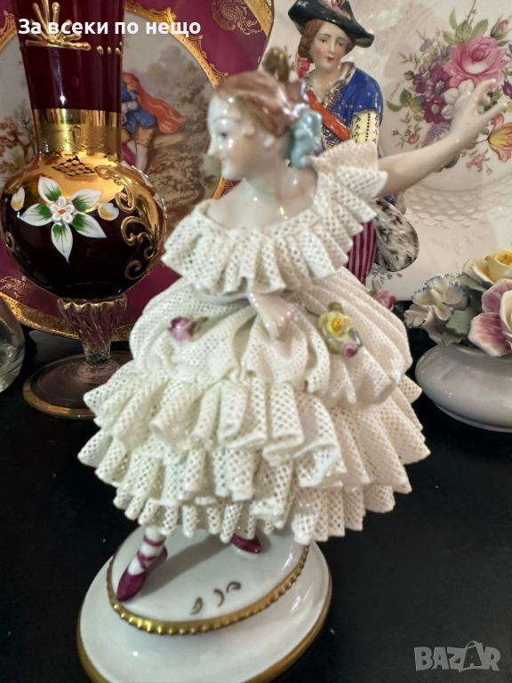 (Älteste Volkstedter Porzellanmanufaktur) Dresden Lace - “Дантелената балерина” една уникално немска дантелена красавица с датировка след 1945 година. Невероятн красота, стил и великолепие, всичко по нея блести, дантелата цветята върху роклята, лицето, постамента, движенията са уловени с върховен финес на немския художник, просто една порцеланова приказка, височина 16 см върховна прелест за всяка колекция или витрина.