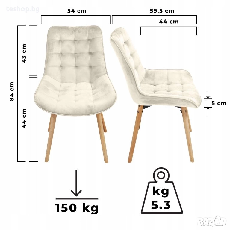 Стабилната облегалка и оформеното седалище с тапицерия осигуряват комфорт при сядане. Надеждността му се основава на здравите крака от бук.