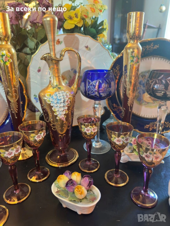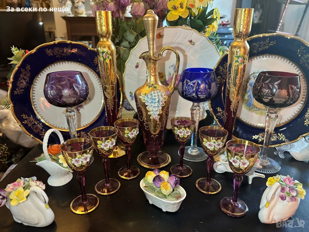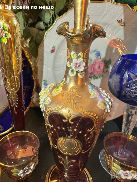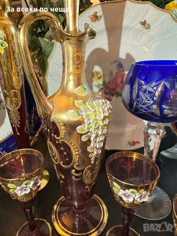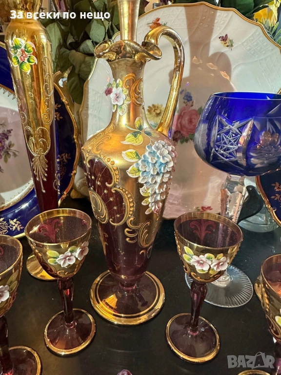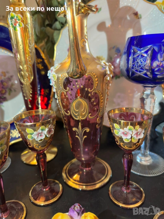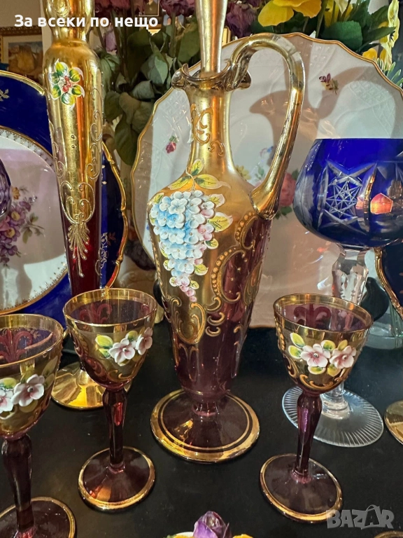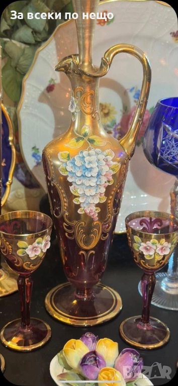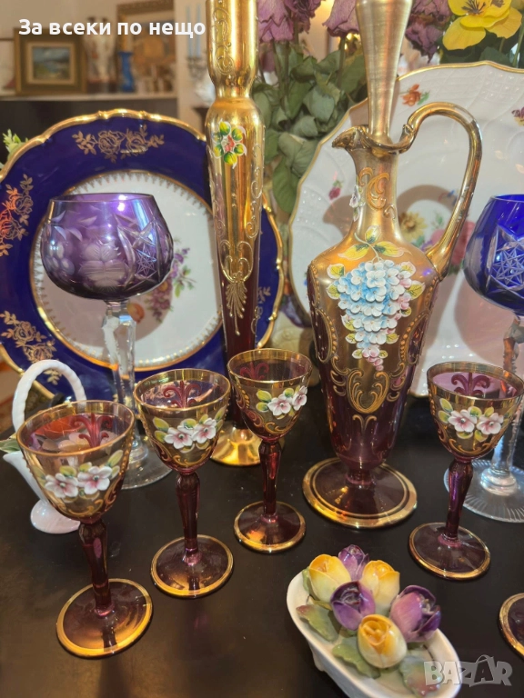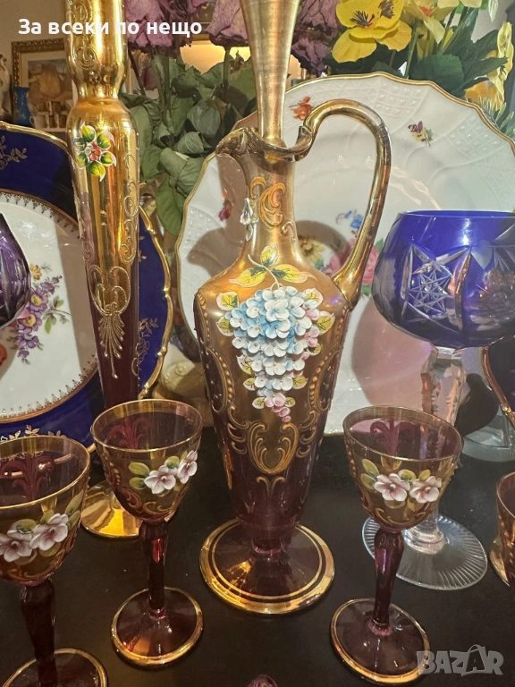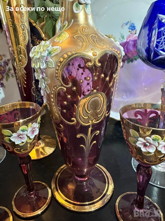 Fancy schnapps Set Decanter Gold Gilt amethyst Enamel Floral прекрасен комплект за силен алкохол в цвят аметист със много и тежко злато 22 карата, фини цветя, разкошна класа и нетрадиционен цвят и вид, чашки около 50 мл, гарафа 31 см висока и около 750 мл, изключително качество с много малки следи от употреба.