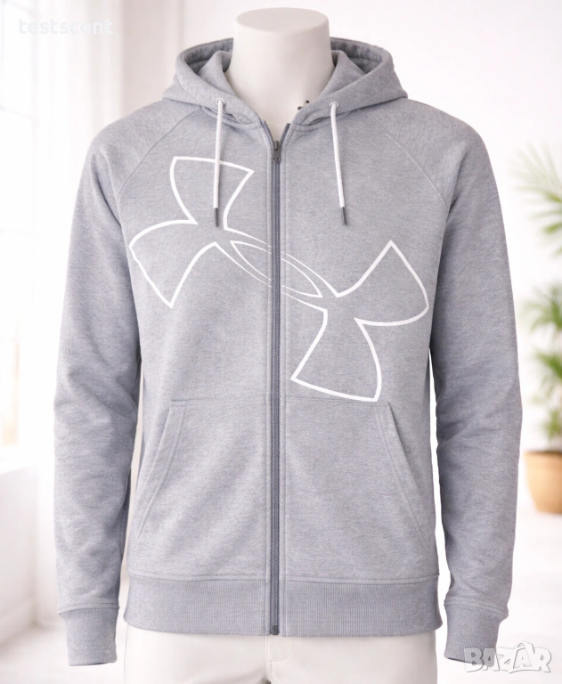 Продавам оригинално Under Armour худи с цип, размер XL (XLarge). Цвят сив, с голямо бяло лого отпред. Удобно за ежедневие и спорт, приятно и меко на допир.