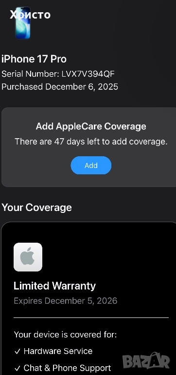 Продавам Apple iPhone 17 Pro, 1TB, 5G, Deep Blue в перфектно състояние, неразличим от нов. Телефонът е ползван съвсем кратко – не повече от 3–4 дни, след което е прибран и не е използван. Няма никакви забележки, удари или следи от употреба и работи безупречно с всички мобилни оператори. Има остатъчна гаранция от около 11 месеца, което дава допълнително спокойствие на новия собственик. Състоянието на батерията е като на нов телефон, с минимален брой цикли, което може да се види на една от снимките. Телефонът се продава в пълен комплект с оригиналната кутия, оригинален кабел за зареждане, който дори не е ползван, както и подарък – оригинален адаптер на Apple. Това е отличен избор за човек, който търси премиум модел с максимална памет от 1TB, топ производителност и сигурност от гаранция, без да плаща цената на чисто нов апарат от магазин. Без бартери!!!