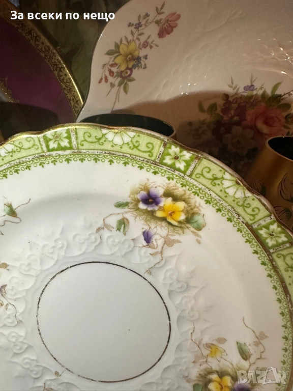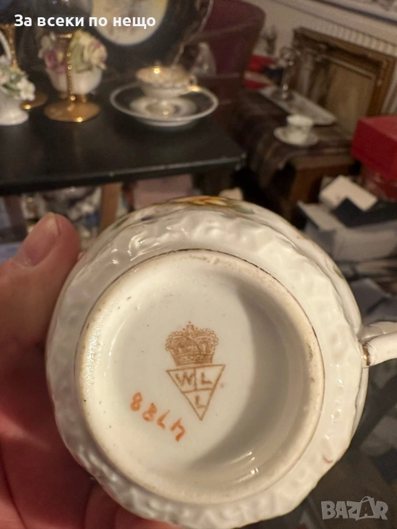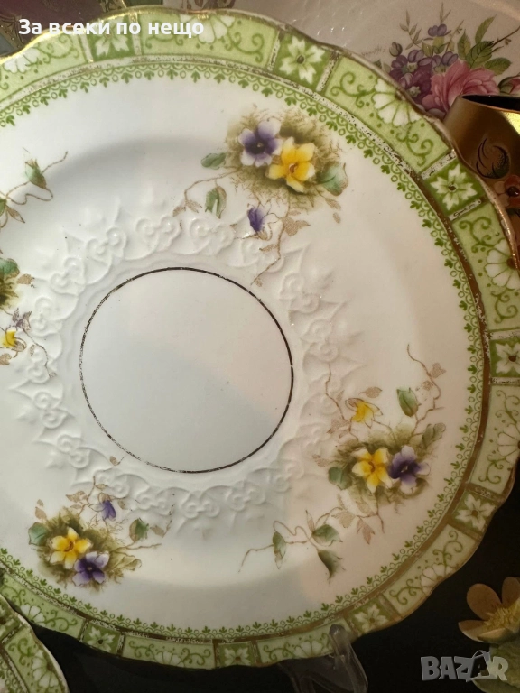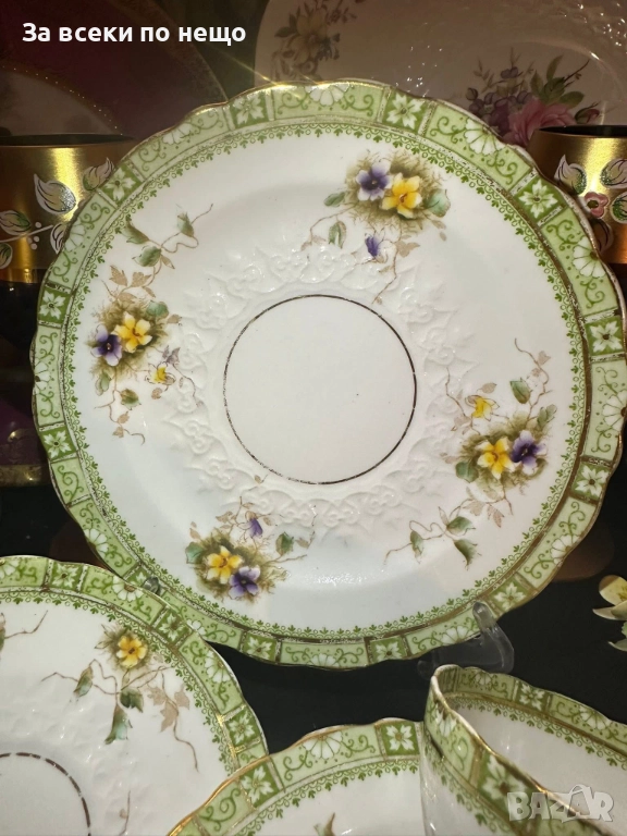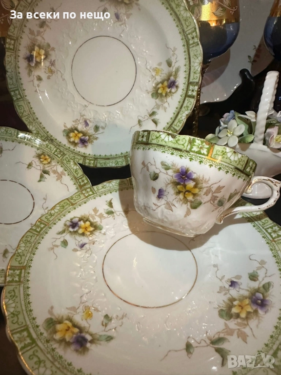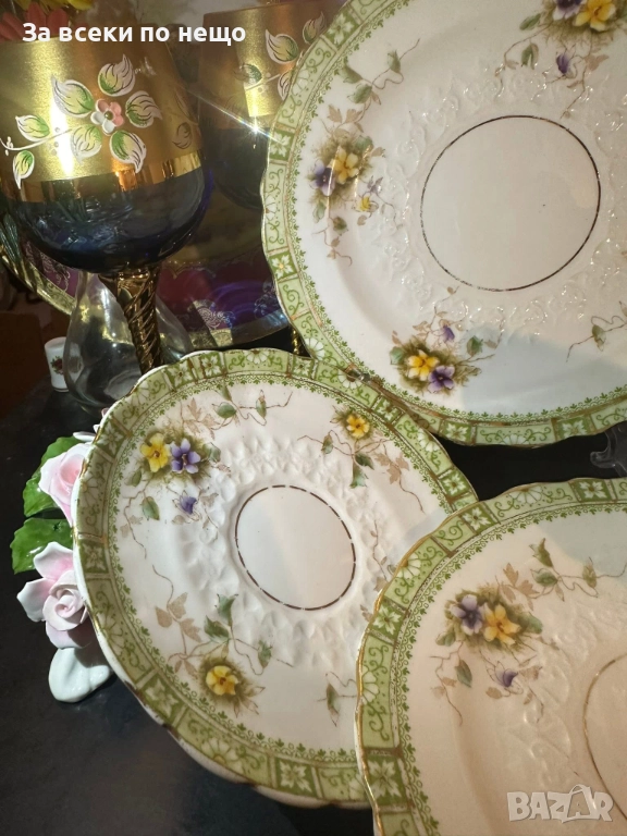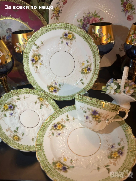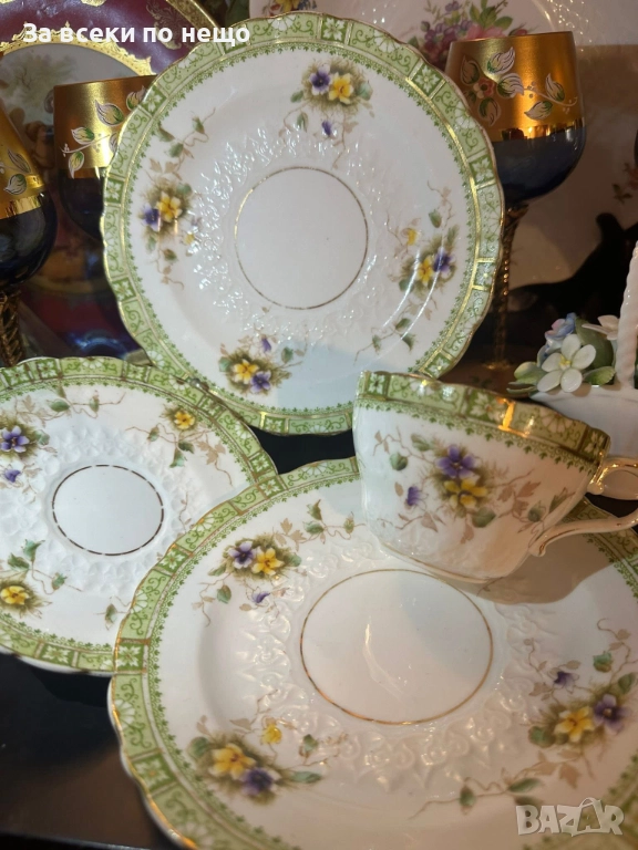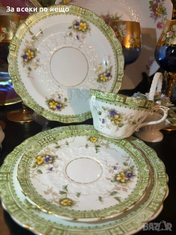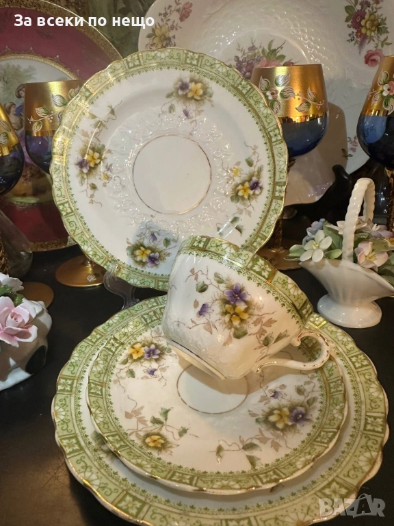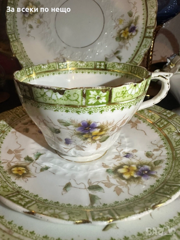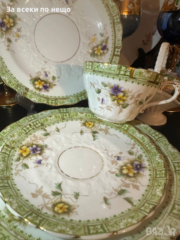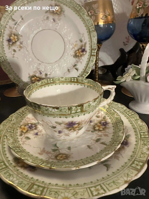 Longton England Circa 1874 - троен сет, мисля уникален и с невероятна красота, изключително рядък модел, трудно намиращ се в Англия, а за България може би несъществуващ, вместимост на чашката около 200 мл, диаметри на чинийките Ф 19 и Ф 15 см, великолепни ръчно нарисувани цветя и букетчета, млечно зелен основен цвят, леки релефни елементи по всички елементи, блестяща визия и историческо великолепие на това истинско произведение на порцелановото изкуство. Възможно е датировката да е дори по стара за началото на 19 век, много добро винтидж състояние.