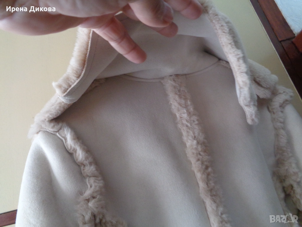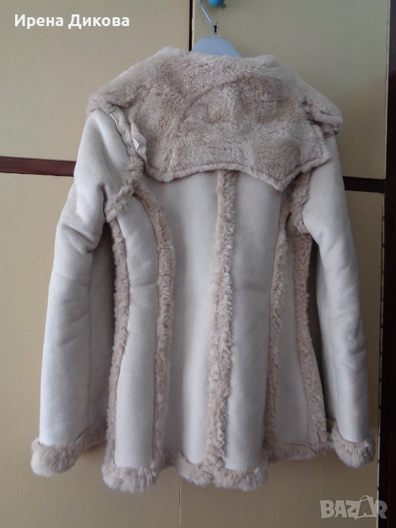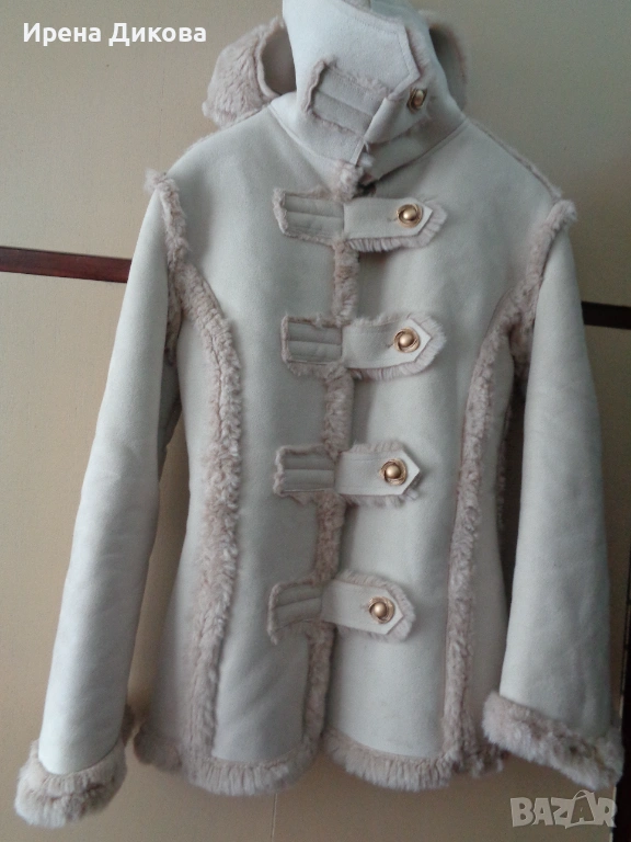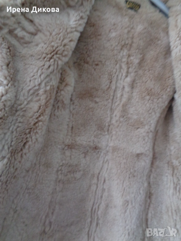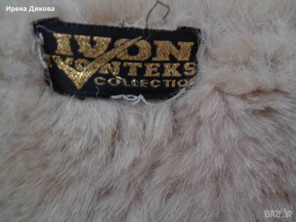 Продавам дамско зимно палто/яке тип кожух, изработено от имитация на кожа (наричана още "mustang" или "shearling" стил), с топла подплата от изкуствен (еко) косъм. Моделът е къс, подходящ за студено време, със свободна яка и маншети с пухкава декорация. Маркиран - с марката "Ivon Conteks" Collection