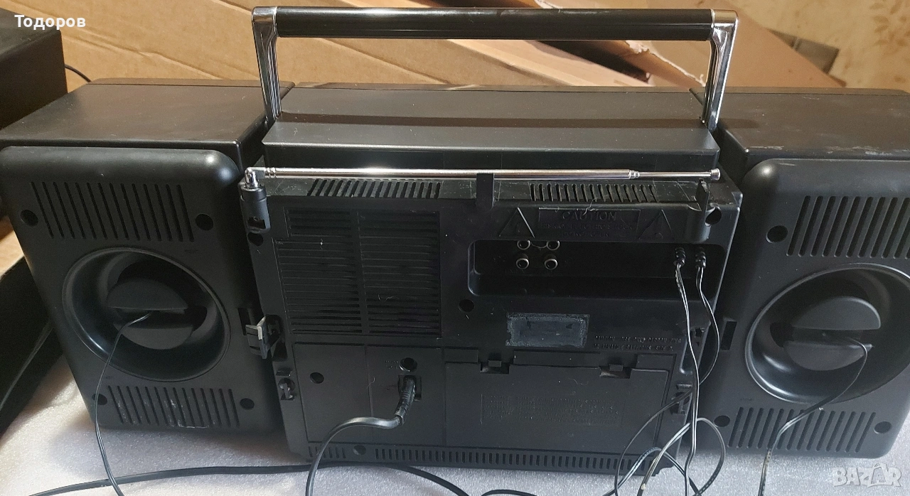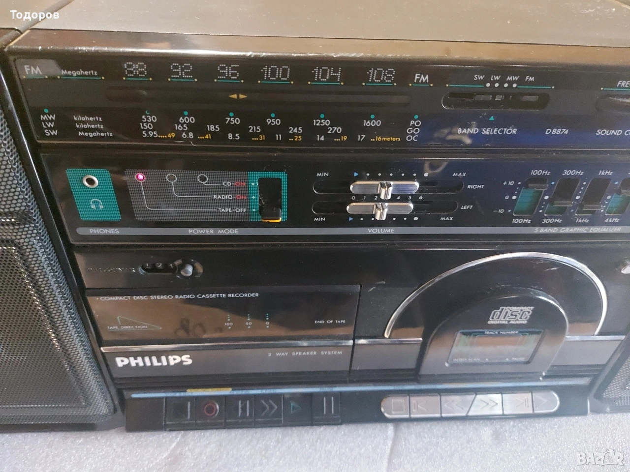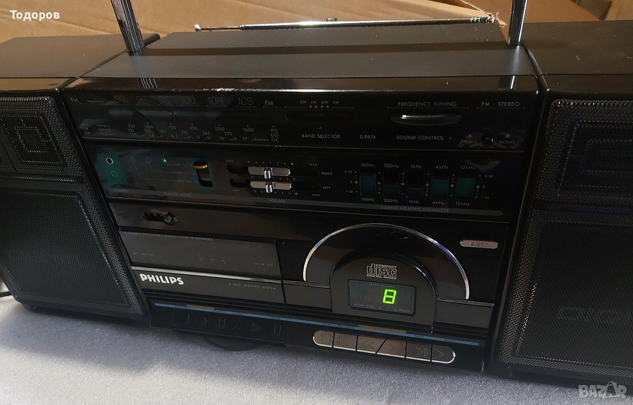 Голям, тежък и с прекрасен звук радиокасетофон Philips D8874. В много добро състояние, външно и техническо. Работи отлично на радио, касета и CD. С откачащи тонколони е. Произведен в Сингапур. С нормални следи от употреба. Като забележка, трудно или не превърта касетата назад! Не е ровено в него.