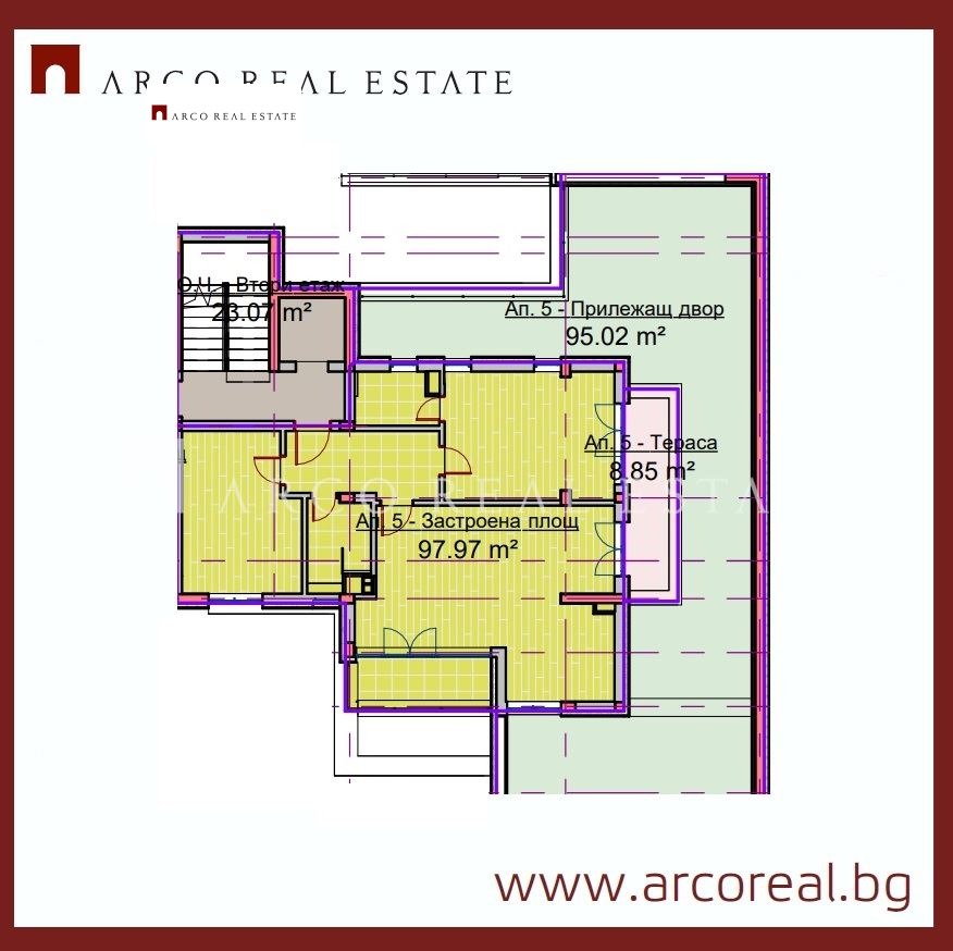 Площ: 89 кв.м. чиста жилищна площ + 104 кв.м. собствен двор и тераса перфектно място за сутрешното кафе, барбекю или отдих на открито.