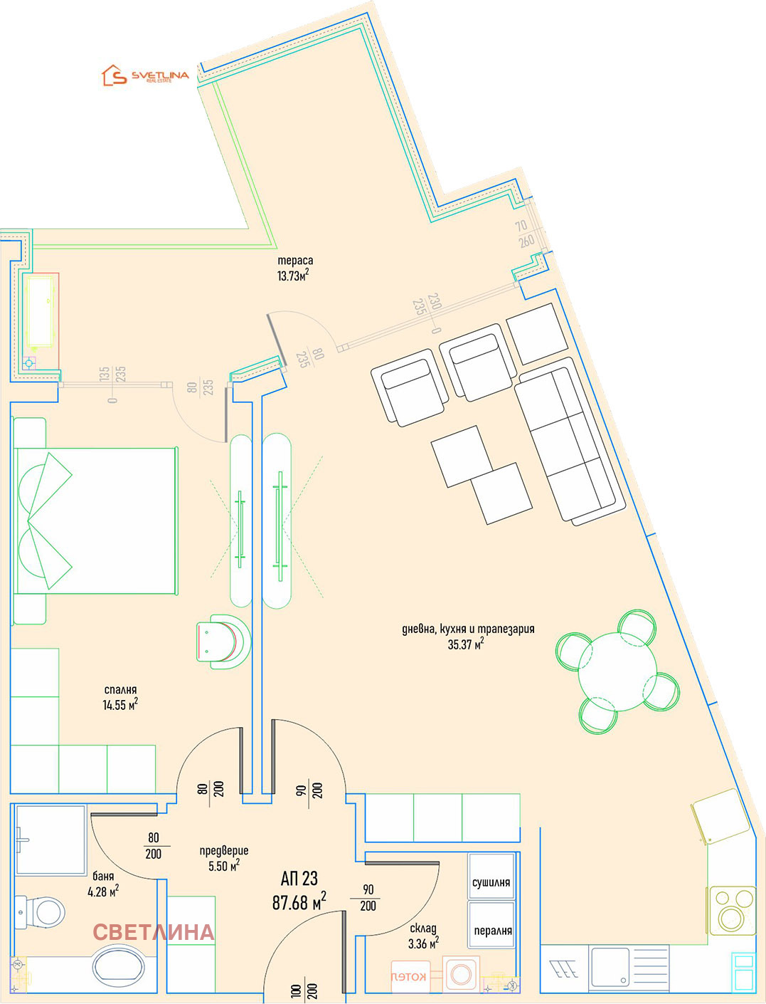 - Застроена площ: 88 кв.м.;