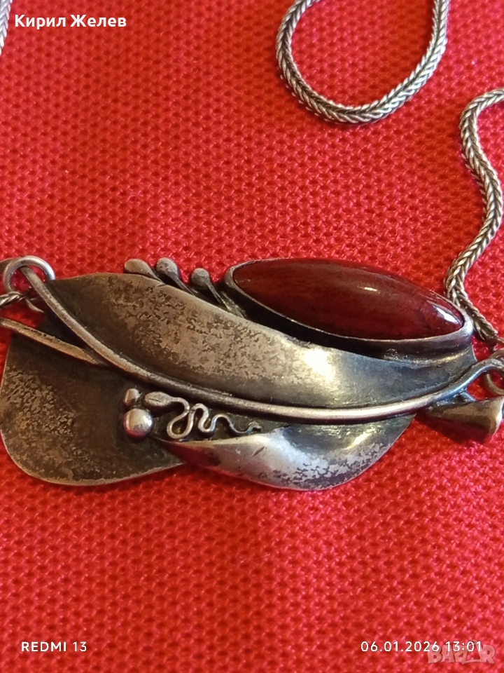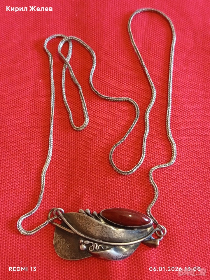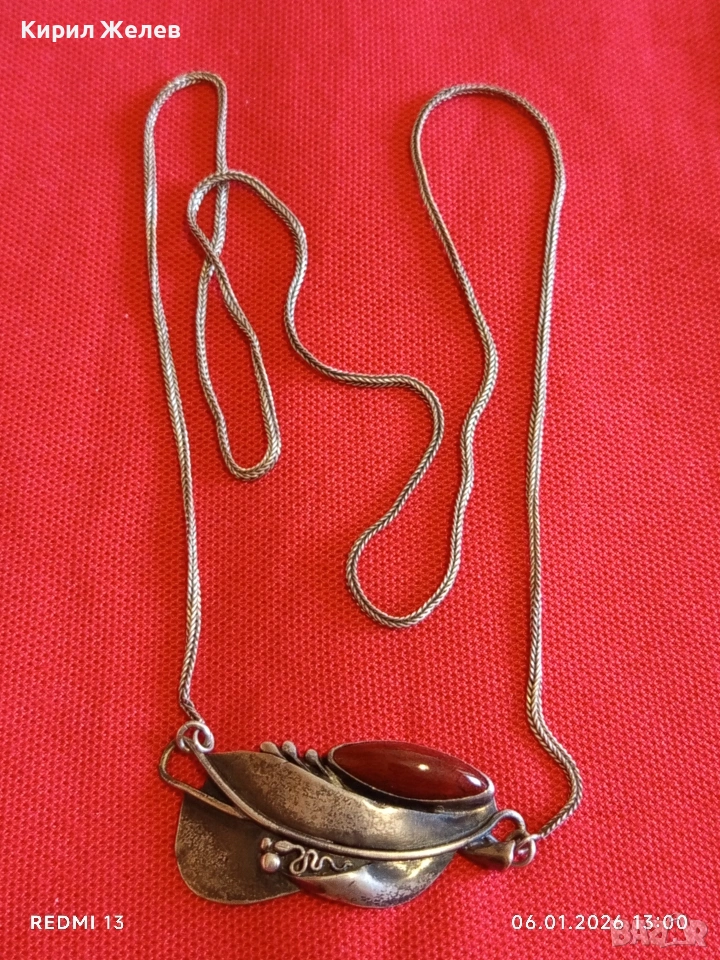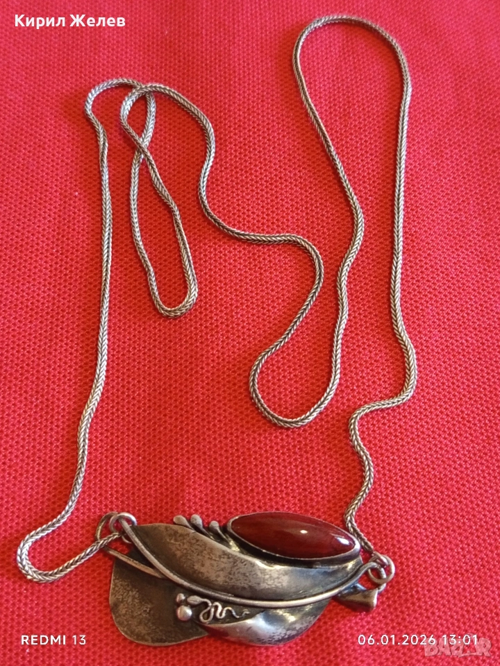 Сребърен ланец с висулка стилизирано листо с инкрустиран Червен Яспис ювелирна изработка 49486