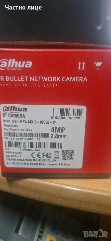 Производител: Dahua technology; Код на продукта: IPC-HFW1431S-0280B-S4 Технически параметри Тип:Bullet Матрица:1/3” CMOS progressive Резолюция на сензора:4 MP (2688 x 1520) Обектив:3.6 мм Цифрово увеличение:16x Хоризонтален ъгъл на виждане:104° Вертикален ъгъл на виждане:57° Бленда:F 2.0 Макс. видео резолюция:2688 x 1520 Видео поток:25 - 30 fps IR осветление:до 30 м Съотнощение сигнал/шум:120 dB Интерфейс:1 x RJ45 Ethernet порт Функции: BLC (Backlight Compensation) HLC (Highlight Compensation) DWDR (Digital Wide Dynamic Range) Детекция на движение Видео компресия: H.265 H.264 MJPEG H.264+ H.265+ Захранване на камерата:DC 12V Консумация:< 5.5 W Корпус: Пластмаса Метал
