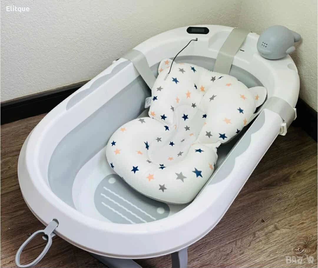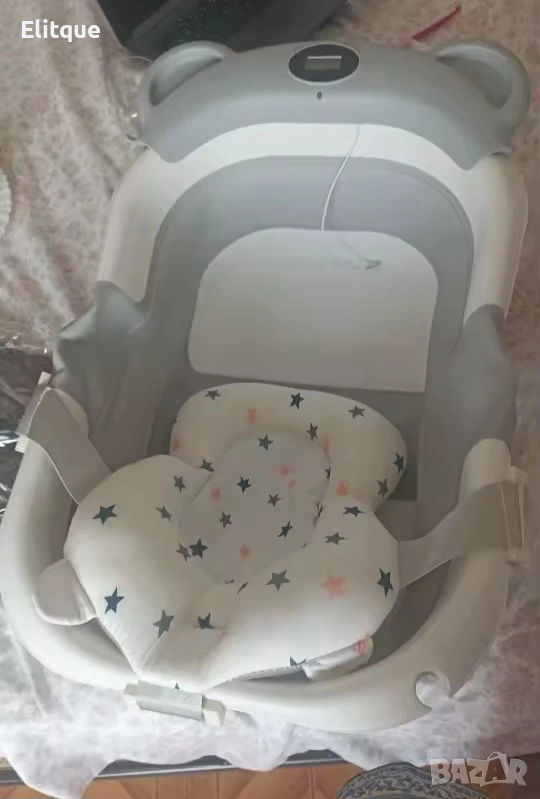 Употреба: деца от 0 до 24 месеца Максимално натоварване: 15 кг Външни размери: 80 × 52 × 20 см Вътрешни размери: 68 × 39 см Дъно на ваната: 62 × 32 см Височина в сгънато състояние: 10 см Материал: 8% полиуретан, 92% полиестер Термометър: електронен LCD, точност 0,1°C