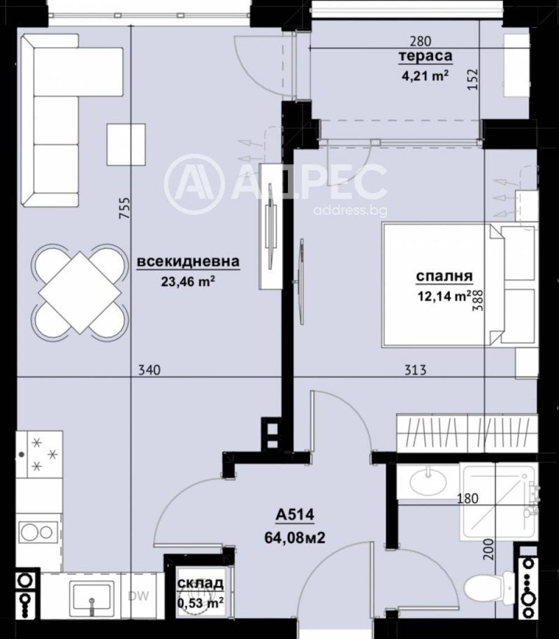 Имотът е с пллощ 64.08 кв. м., етаж 5 от 9, асансьор.