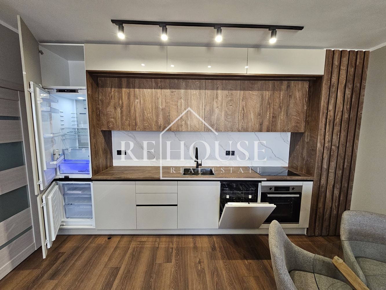 Кухня с вградени уреди: хладилник, фурна, керамични котлони, съдомиялна