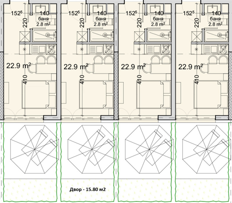 Състои се от входно антре, основна стас кухненски бокс, комбиниран санитарен възел и собствен двор.