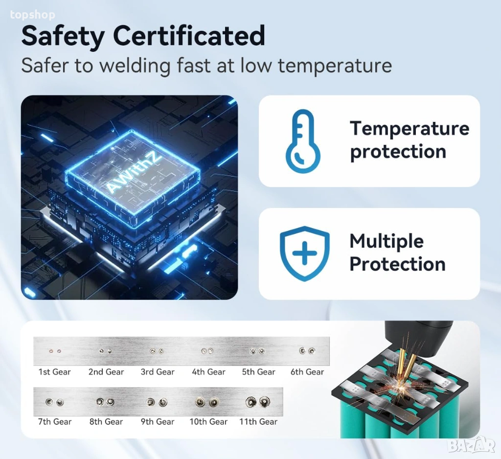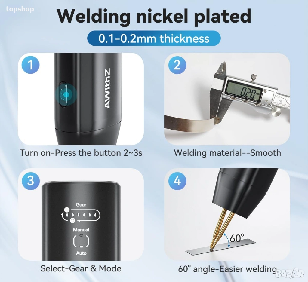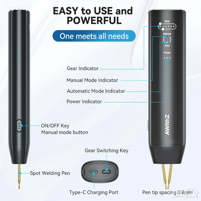 точково заваряване: Писалката за точково заваряване е с дължина 40 сантиметра/16 инча, с медна писалка за заваряване и игла за заваряване от алуминиев оксид и мед с ултра ниско съпротивление, устойчивост на окисляване, удобен захват и лесна употреба.