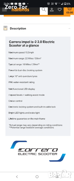Тротинетка Carrera impel is-2 2.0 за продажба, сравнително нова на 232 мили, докарана от Англия.