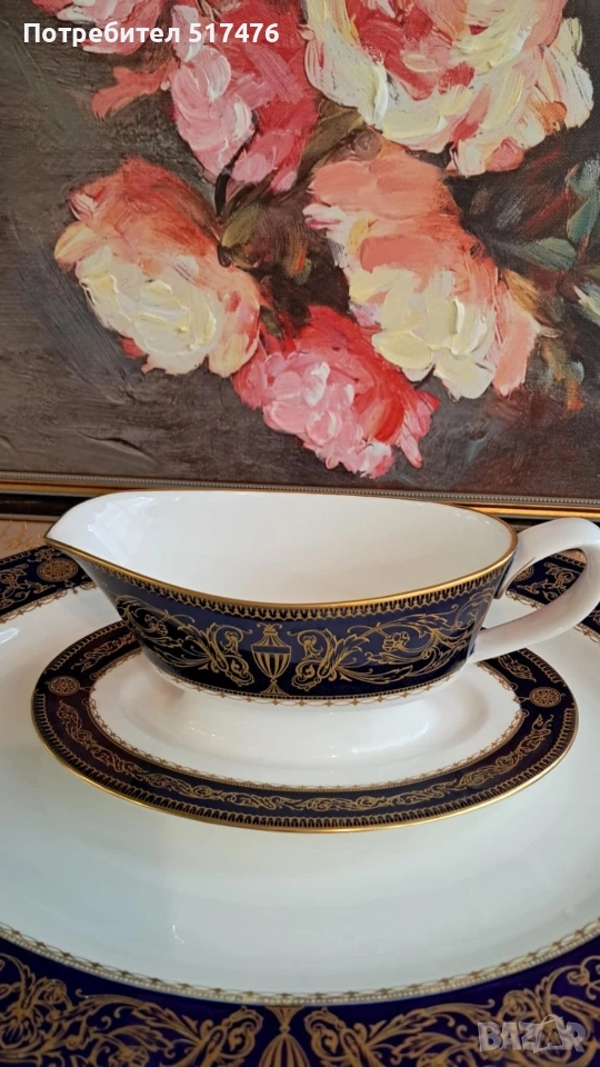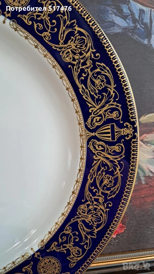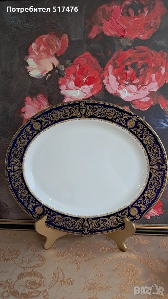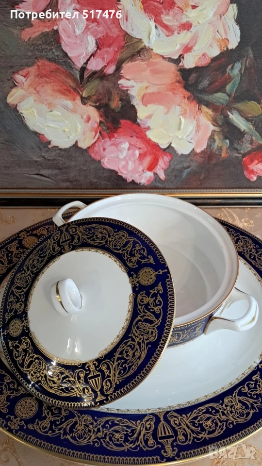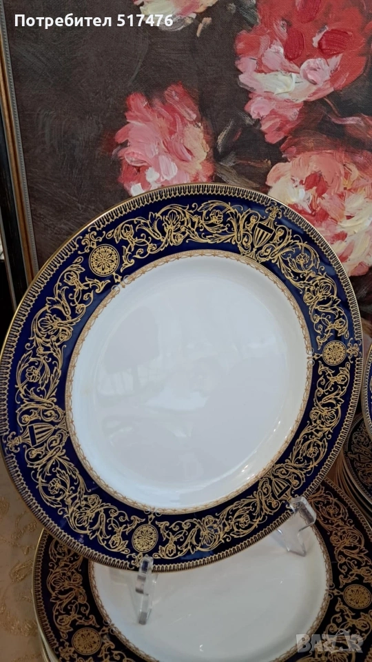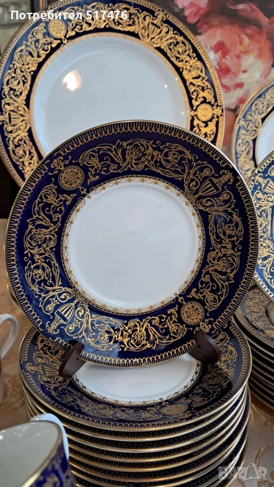 Royal Worcester Sandringham Cobalt Blue Колекционерски сервиз за 12 човека на една от най- старите английски марки порцелан. Ценен заради неговата изключителна елегантност , високо майсторство и изтънчен декоративен стил. Изработен от фин костен порцелан. Отличава се с наситено кобалтово синя ивица ,подчертана с пищна златна орнаментика от 22-каратово злато и класически елементи. Всяка част носи фабричен знак на Royal Worcester ,който включва числото "51"в центъра в чест на основаването през 1751г. Състои се от: -12бр.чинии с диаметър 27см -12бр.чинии с диаметър20.3см -12бр.чинии с диаметър15.6см -12бр.чаши за чай -220мл -12бр.подложни чинии с диаметър 14.7 см - 1бр голямо плато елипса с размери 39/33 см - терин с размери 25.5/12 см. - сосиера с вградена подложна чиния размери 22/9 см Цена 1940€/ 3794.31лв