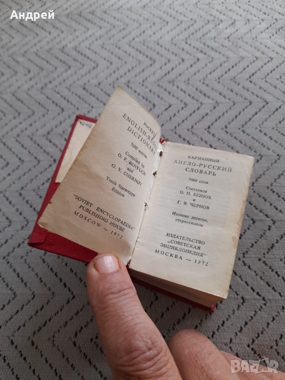 Стар Английско Руски речник, снимка 1 - Други ценни предмети - 53012104 Стар Английско Руски речник, снимка 2 - Други ценни предмети - 53012104 Стар Английско Руски речник, снимка 3 - Други ценни предмети - 53012104 Стар Английско Руски речник, снимка 4 - Други ценни предмети - 53012104 1/4