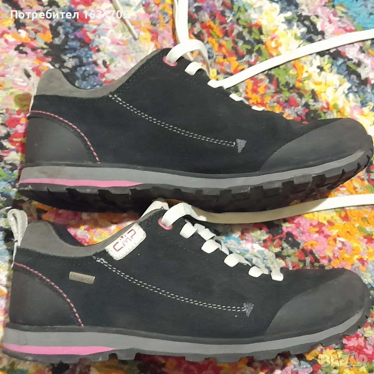 Обувки CMP италиански, номер 39. Носени са няколко пъти, но все по-малко ми се отдават възможности за преходи. Стават както за градски, така и за планински терени. Много красиви. Стелката е с Ortholite технология, водонепропускливи - WaterProof, с антикорозивен гумен слой на подметката Vibram технология - много стабилни. На пръстите и на петата имат предпазно подсилване. Естествен велур - черен.