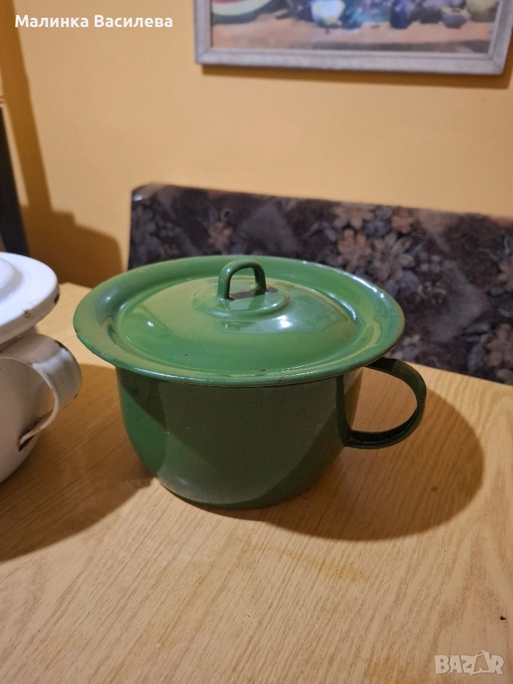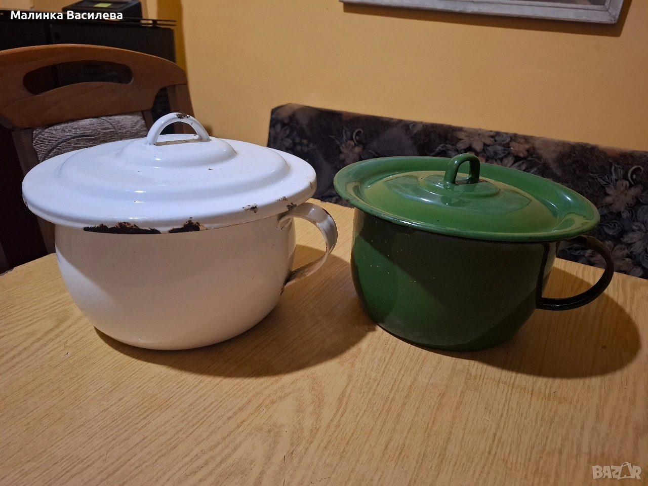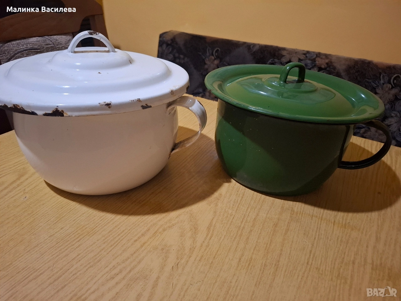 Продавам 2 броя емайлирани съдове с капаци, старо производство.