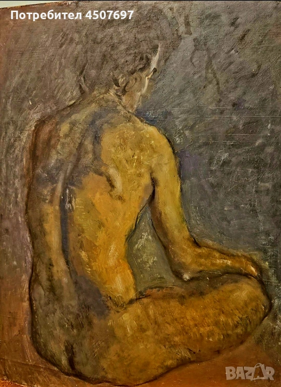 Картината е фигурална маслена живопис Върху шперплат, изобразяваща женски акт в оранжеви и тъмни тонове.