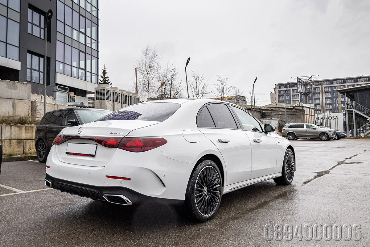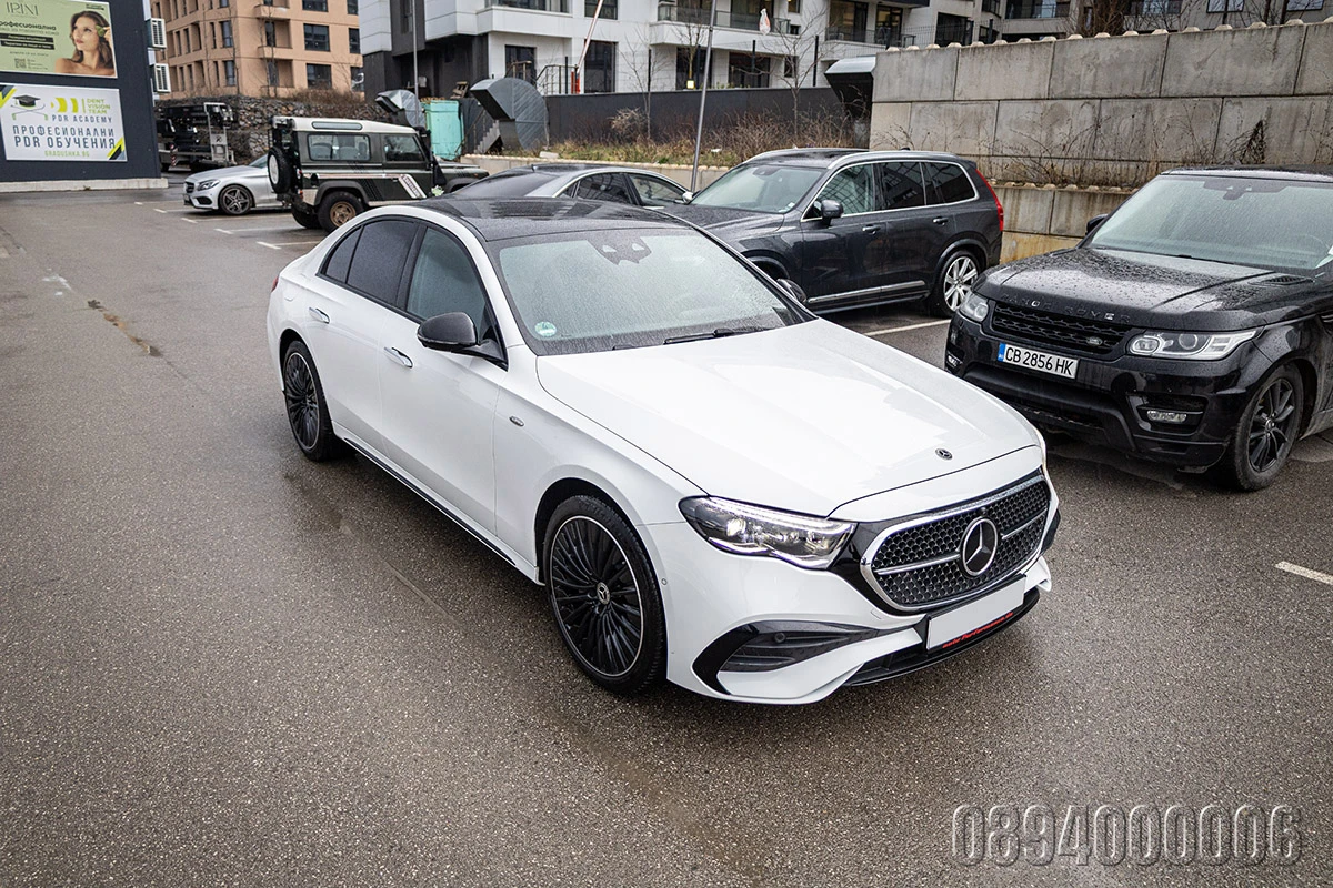 Цена като нова 111900 евро, модел 2026 година, дата на първа регистрация 23/05/2025 г, E300 DE AMG, PLUG-IN HYBRID, комбиниран автомобил на ток и нафта, дълга база, Външен цвят - бял перлен металик /DESIGNO/, интериор ексклузивна черна кожа напа в комбинация с алкантара/ DESIGNO/, орнаменти - натурално дърво и алуминий /DESIGNO/, пълно кожено оборудване от мека и гладка кожа /DESIGNO/. нощен пакет екстериор, DESIGNO пакет интериор, BURMEISTER 3D HIGH END озвучителна система. DIGITAL LIGHT ЛЕД фарове, спортни седалки с подгряване и мемори, keyless go, всички видове асистенти, печка с дистанционно с възможност за отопление и охлаждане, гласови команди, ENERGYSING PACKET, R-BALANCE PACKET, всички видове камери, Мерцедес Connect me, Mercedes Benz светещи прагове, стъклен панорамен таван, черен таван (DESIGNO), мултифункционален спортен волан AMG подгряване, двойни шумоизолирани акустични затъмнени назад стъкла, електрически теглич, керамично покритие на боята на автомобила, 2-зонов климатроник и много други. 20 цола AMG оригинални джанти на Мерцедес с летни гуми. перфектен автомобил без забележки, гаранция от Мерцедес до 23. 05. 2027 г. с възможност за удължаване. Каско и ГО до 01/2027 г. Крайна Цена! ! !