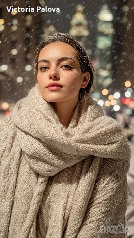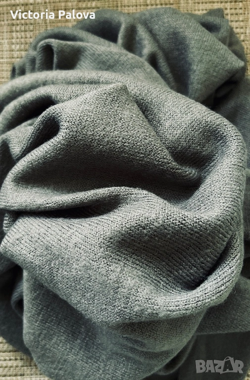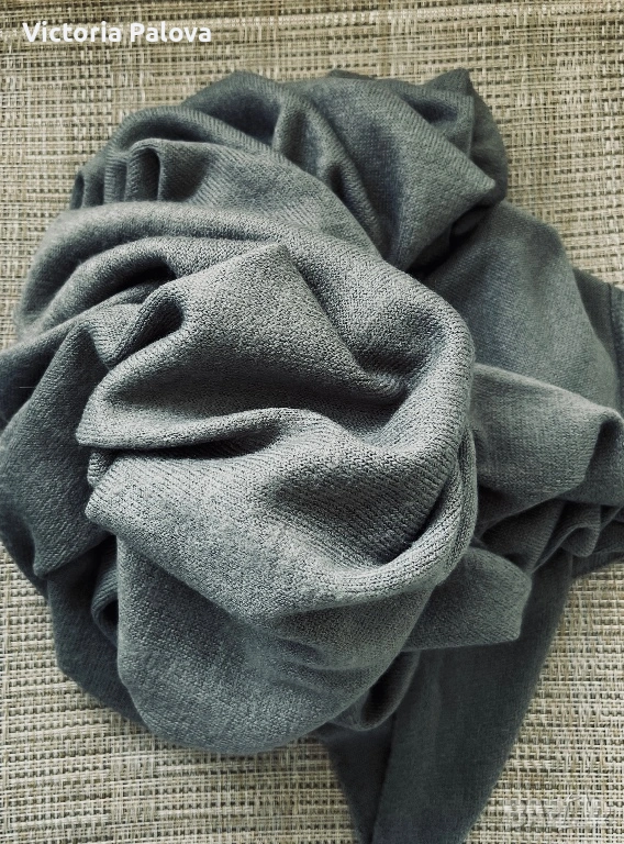 Мека нежна тънка материя, включваща вълна,осигурява изключителен комфорт и топлина, без да дразни кожата. Цветът е елегантен сиво-зелен , маслинен нюанс, преливащ към сиво. С размери 200см на 75см, този шал е достатъчно голям, за да се използва не само като класически аксесоар, но и като стилна пелерина или леко одеяло. Особено красив е , като се увие около врата - големият му размер позволява да се драпира много елегантно, създавайки меки вълни и уникален , изтънчен вид.