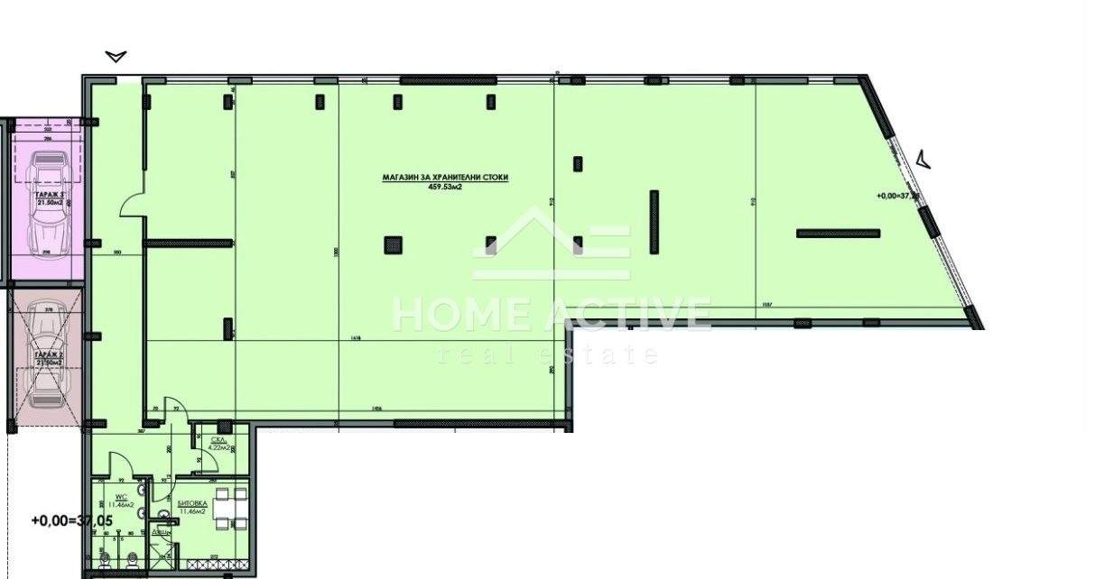 -Просторна търговска зала, позволяваща гъвкаво зониране касови зони, обслужване, самообслужване, експозиционни и търговски площи.