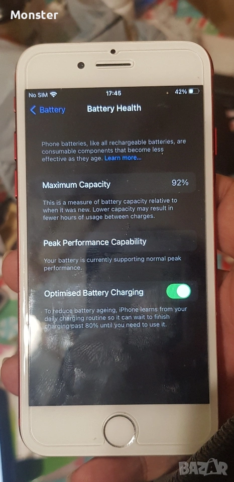 iPhone 7 Red 128Gb power battery 92% ,работи със всички оператори, няма iCloud.Давам зарядно . Цена 155€.
