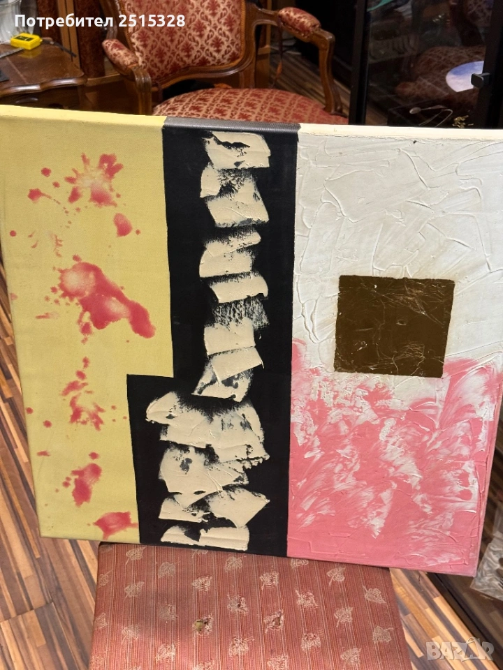 Картина в абстрактен арт деко стил, изобразяваща геометрични форми и фигури в топли тонове. Маслена боя върху платно, с видими следи от употреба. Подходяща за украса на дома или офиса. размери 60/60см