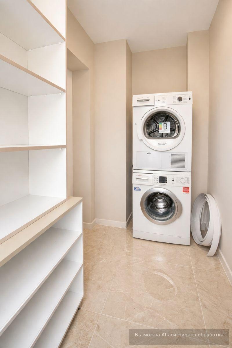 Разпределение: входно антре, хол с кухненски бокс, две спални, две бани с тоалетна, перално помещение, две тераси