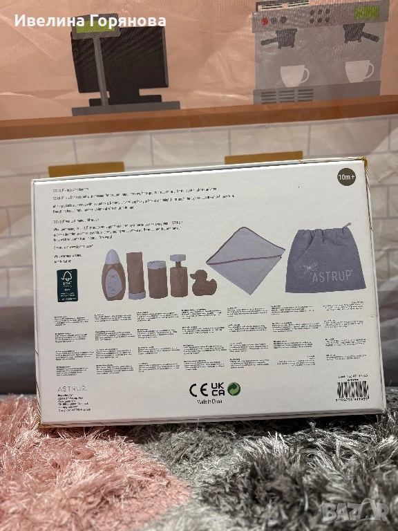 НОВО Стилен и висококачествен дървен комплект за игра, подходящ за всички малки любители на кукли. Сетът включва аксесоари за „баня и грижа“ – шишенца, тубички и фигурка, изработени от дърво и съобразени с детския захват.