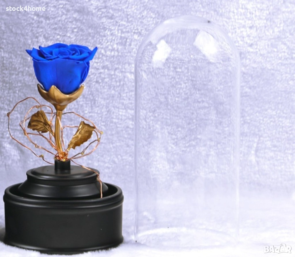 Неувяхващата роза е създадена от истинско растение, преминало през иновативен процес на консервация. Този метод запазва структурата, мекотата и естествения вид на листенцата, като ги предпазва от изсъхване, ронене и промяна на формата. Стъблото и листата са фино изработени в бронзов ефект, който придава лукс и завършен вид. LED светлините около розата правят аранжировката още по-магична, особено вечер. Черният постамент и стъкленият купол защитават цветето и го превръщат в стилна декорация за хол, офис, спалня или витрина. Подаръкът идва в луксозна кутийка с легло за стъкленицата, което го прави перфектен за изненади, официални поводи, Свети Валентин, сватби и годишнини. Цветовете варират – нежни, ярки или преливащи, всеки със свой характер и стил.