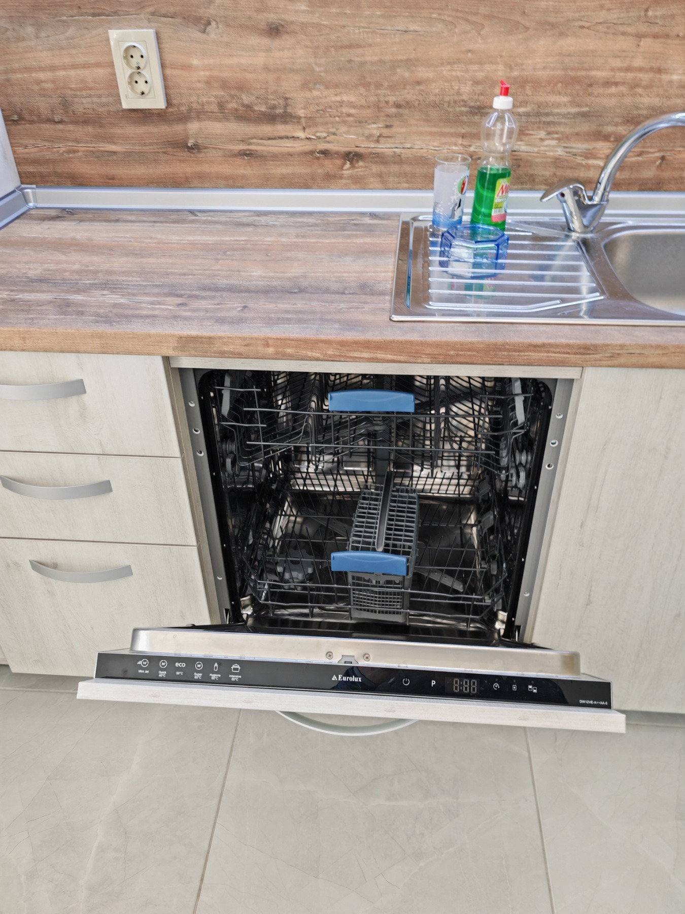 Кухнята е оборудвана с вградени електроуреди хладилник, микровълнова фурна, съдомиялна и вградена фурна.