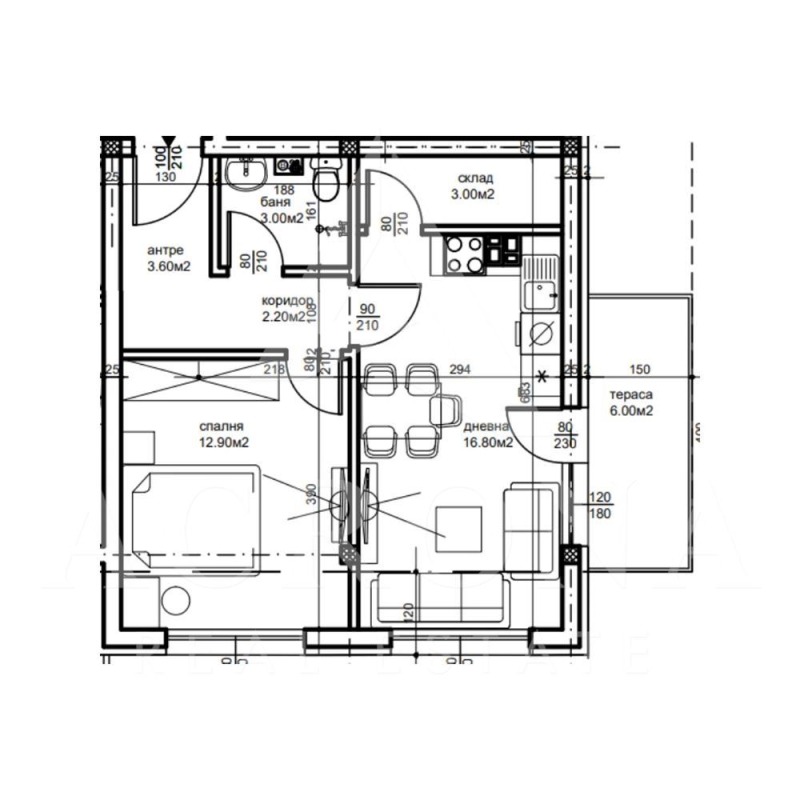 Разпределение - Светла функционална всекидневна с кухненски бокс, самостоятелна спалня, баня с тоалетна, килер, тераса, входно антре.