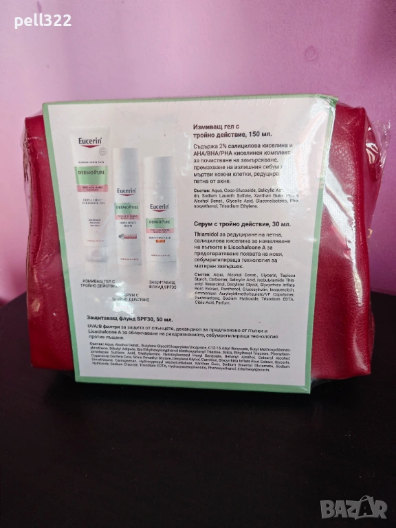 Eucerin DermoPURE Tripple Effect Serum представлява серум с тройно действие, който редуцира пъпките, контролира лъщенето на кожата и редуцира петна, следствие от акне (постинфламаторни хиперпигментации), като действа в основата на проблема: производството на меланин. При петна - патентованият thiamidol редуцира упоритите петна, следствие от акне, и предотвратява появата им, при пъпки - салициловата киселина ефективно редуцира пъпките и Licochalcone A помага, за да не се появяват нови пъпки, при лъщене - себум-регулиращата технология предоставя дълготраен матиран завършек на кожата. Формулата не е мазна и е некомедогенна (не запушва пори). Дерматологични проучвания доказват: добра кожна поносимост и ефикасност на кожа, склонна към акне, и с петна, следствие от акне.