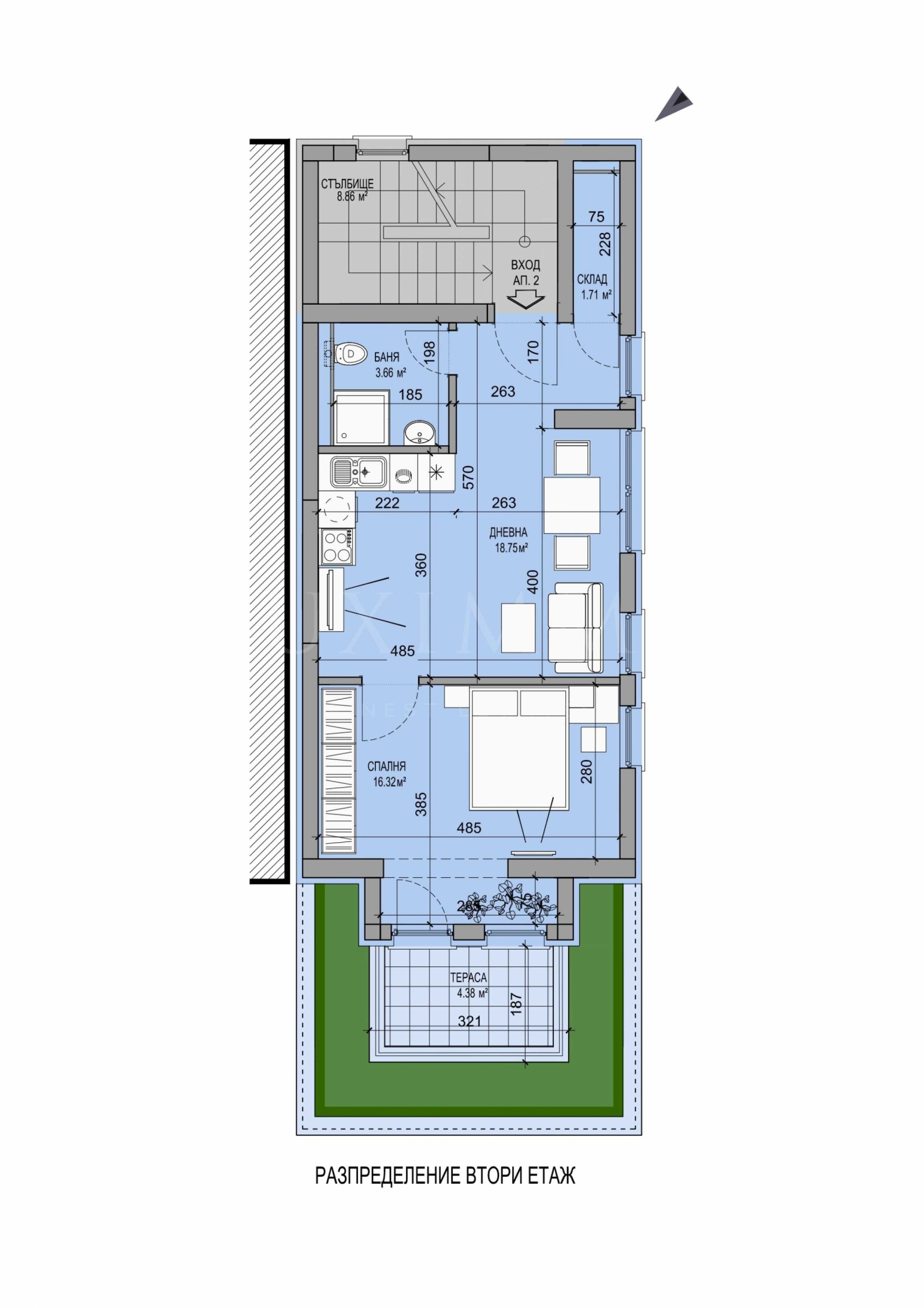 Жилището е разположено на трети етаж в сградата и има следното разпределение: