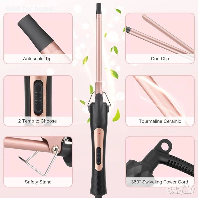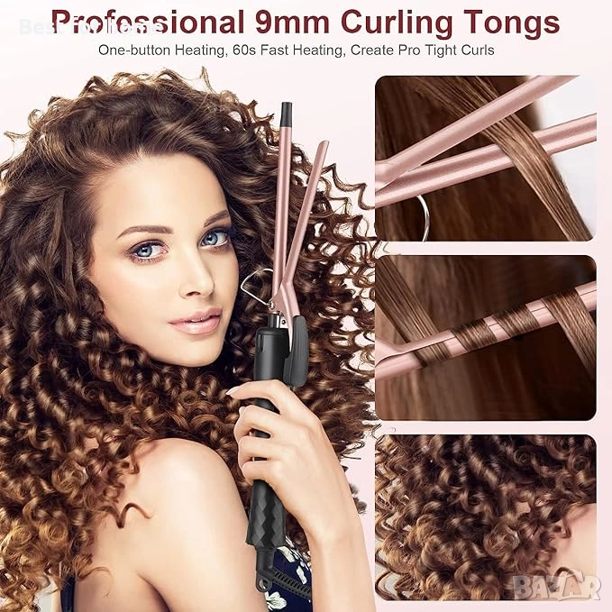 Керамична маша за къдрене: С 9 мм (3/8 инча) керамичен цилиндър и въртящ се на 360° захранващ кабел, можете лесно да създавате стегнати къдрици и винтови къдрици както за къса, така и за дълга коса. Използва турмалинова керамична технология за равномерно нагряване, намалява увреждането на косата и прави косата ви естествена за постигане на резултати като от салон.