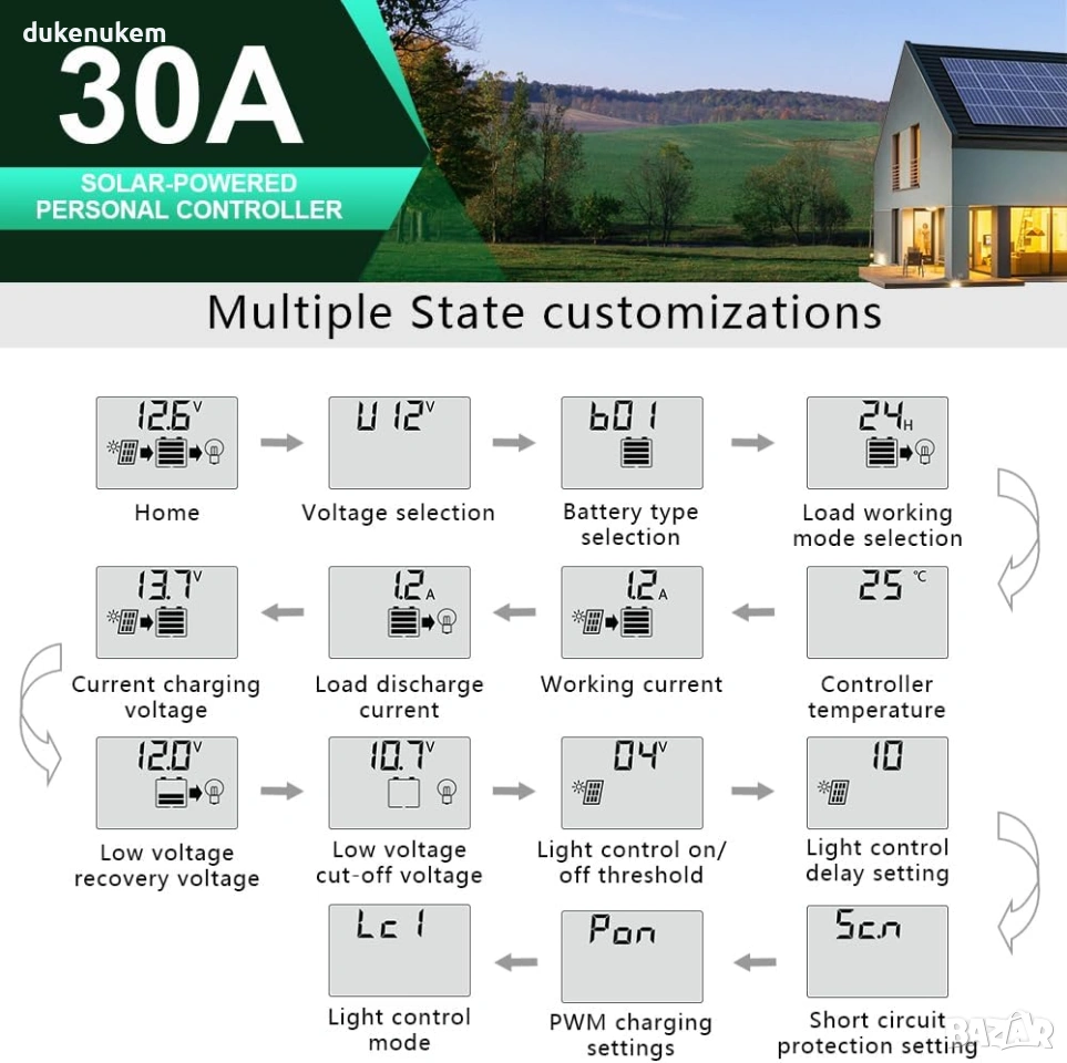 PWM соларен контролер 30A за 12V и 24V системи с LCD дисплей и USB портове