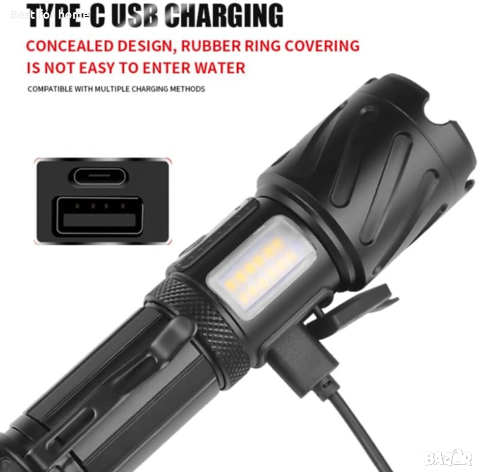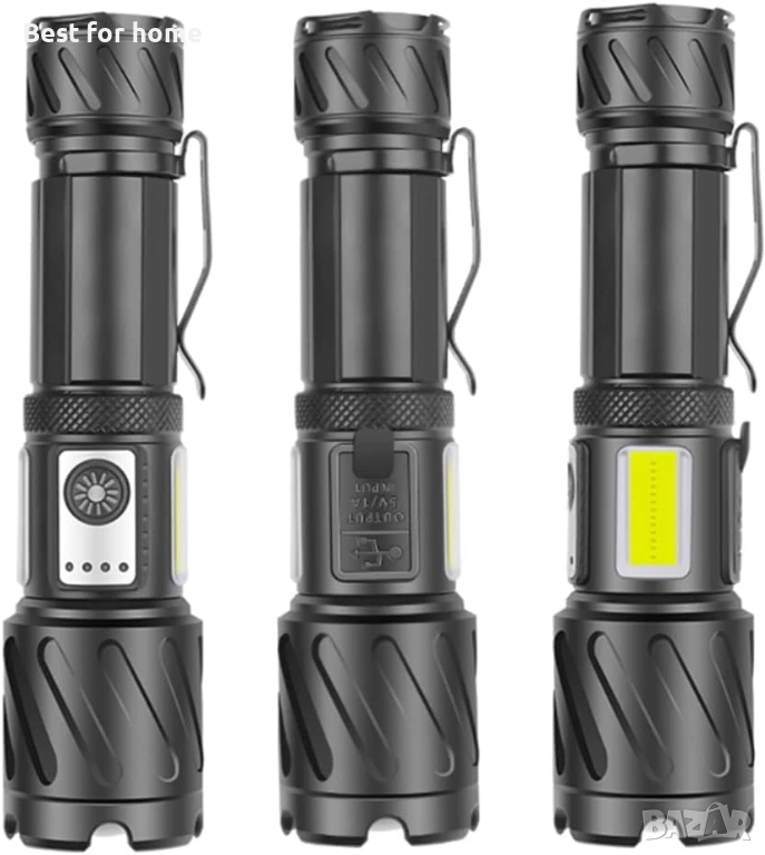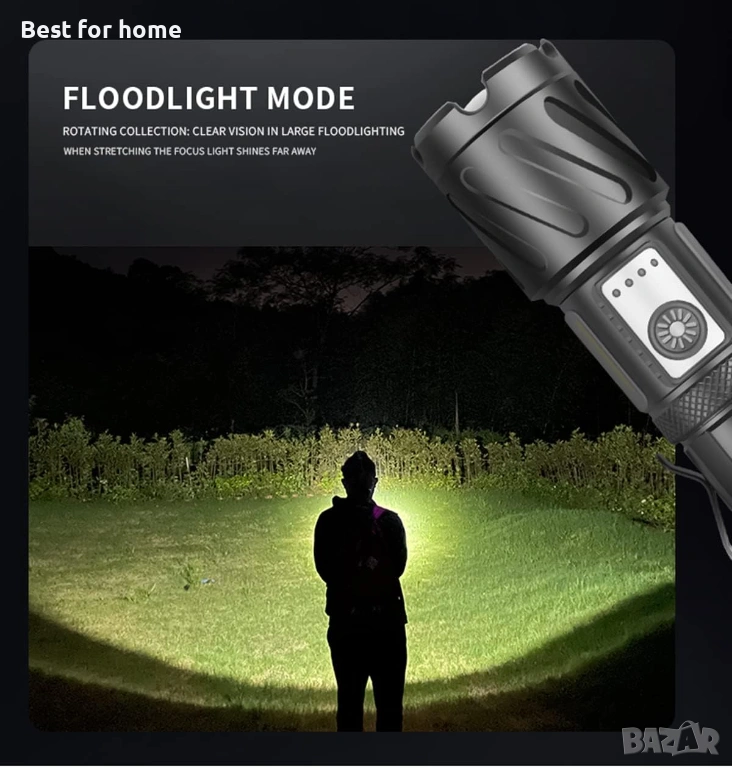 【Супер ярък XHP99 LED +COB】Този мощен LED фенер е оборудван с подобрен XHP99 LED чип с живот 500 000 часа, който може да излъчи до 20 000 лумена и да издържи до 500 метра. Режимът на супер ярко прожектор улеснява осветяването на цяла стая или детска площадка.