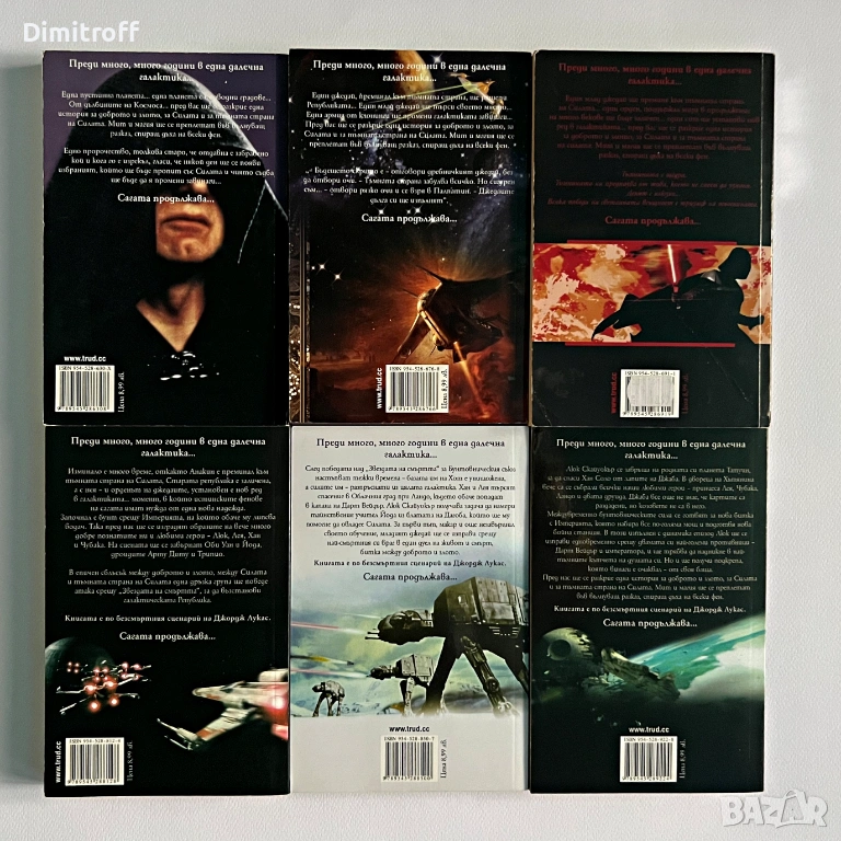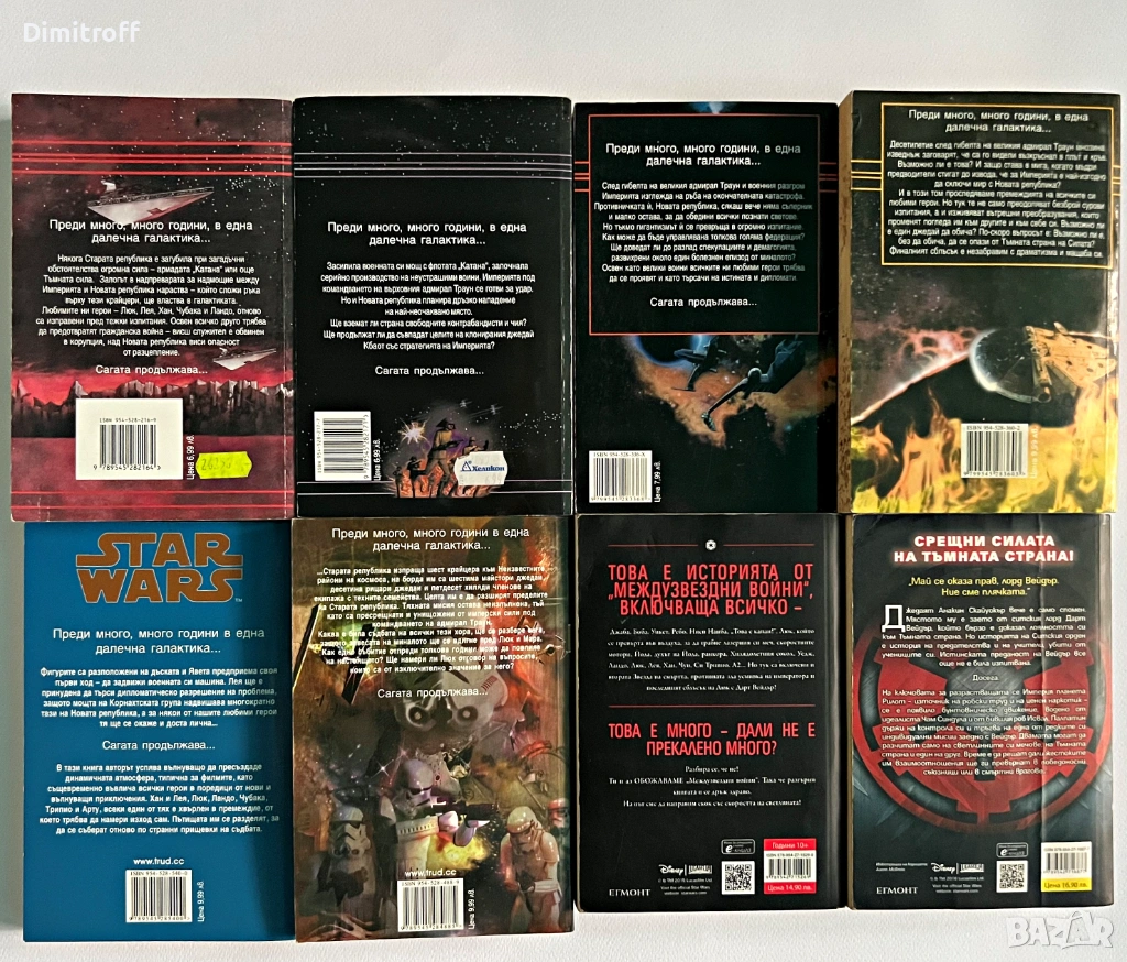 Продавам колекция от книги Star Wars на български език, разделени по логични пакети. Книгите са от лична библиотека, поддържани и съхранявани на сухо място.
