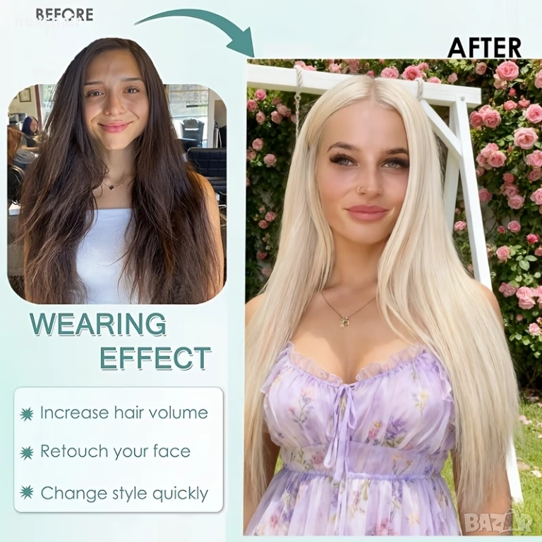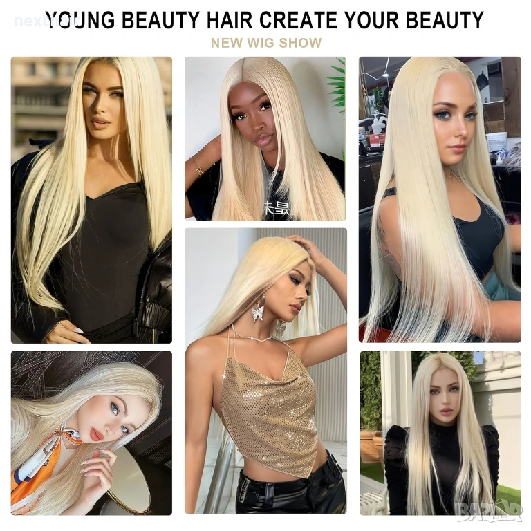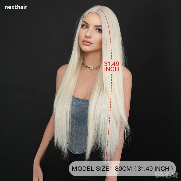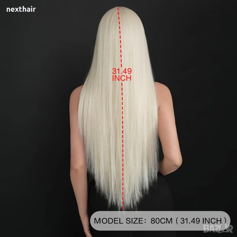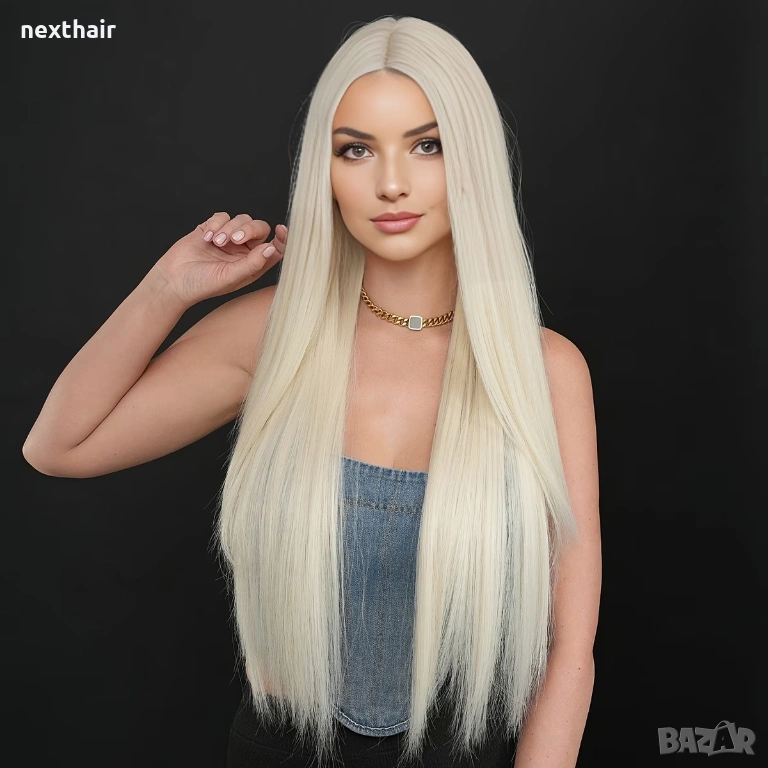 Дълга синтетична перука, 80 см, в платинено светло рус цвят. Моделът е прав, с естествено изглеждащ път, подходяща за ежедневие, фотосесии, събития, косплей или парти.