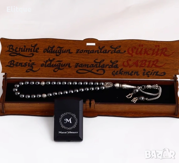 Нашата броеница е изработена от хематит – камък против стрес. Поради напрегнатата среда в днешно време това е един от най‑предпочитаните модели от естествени камъни. Буквите в края са изработени от метал. Дължината на броеницата е 24 см.