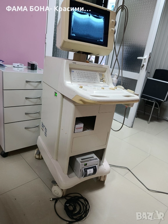 производство, в напълно работещо състояние! Апарата е подходящ за обща ехография и разполага с две сонди 8MHz,3.75MHz и работещ принтер Mitsubishi за моментален печат на изображения зареден с термо ролка хартия+резервна 110ммх20м, Гел Ultrasound. Апарата е ползван за глава и шия.