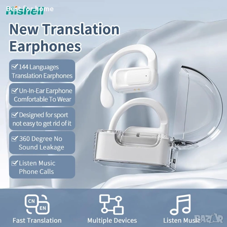 Тези слушалки за превод на езици BL02 с окачка за уши и Bluetooth, предлагани от HiShell, използват бинаурален HD микрофон и приложение, съвместимо с iOS и Android, с отворени уши, осигуряват бърз и прецизен превод на 144 езика и акцента. Можете да изберете правилния режим на правилното място и ситуация, слушалките за превод поддържат режим на докосване, режим на свободно говорене, режим на високоговорител, удобни, гъвкави и интелигентни. Ултра комфортни, леки дизайни, плътно прилягащи, ергономични слушалки с отворени уши. Те не само осигуряват безупречен превод, но и служат като универсални устройства за музика и телефонни разговори. Тези безжични Bluetooth слушалки за превод с отворени уши предлагат превъзходно качество на звука. Превъзходна производителност на батерията, с пълно зареждане и в режим на готовност до 10 дни, USB-съвместима кутия за зареждане.