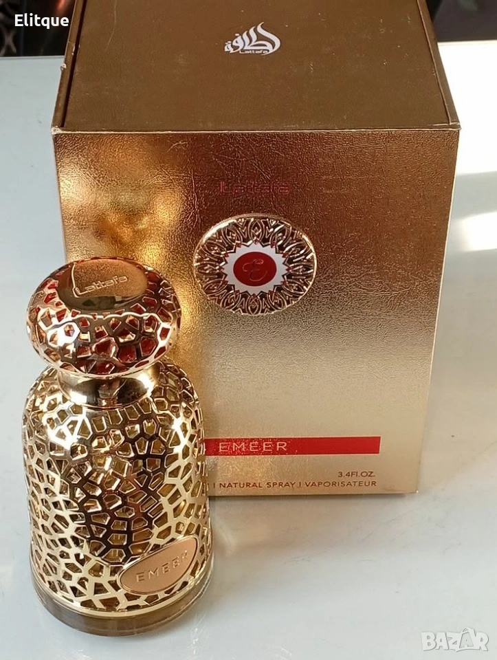 Арабски парфюм Lattafa EMEER, 100мл (EDP). Кутията има Led светлина и свети . Свежестта и чистотата се определят от луксозна и изискана рамка, която се състои от кехлибар, пачули, кедър и кашмир. Толкова много елегантност, мекота и дълбочина в един впечатляващ аромат. Нека и Вашата парфюмна колекция блести със златиста светлина, а тялото да бъде залято от луксозна свежест. Връхни нотки: лимон, бергамот, градински чай, плодове от хвойна. Сърдечни нотки: кардамон, бял чай, сандалово дърво, олибанум. Основни нотки: амбра, пачули, кедър, кашмир. Парфюмите MARABIKA са оригинални производители от ОАЕ и отговарят напълно на показаните на снимките.